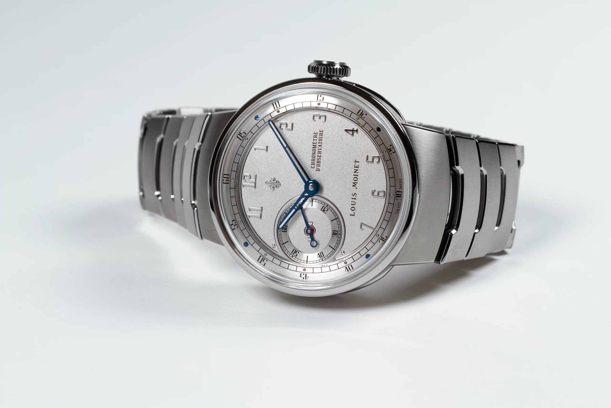 As for the bracelet, it was given the name “BRIDGE project.” It is the first grade 5 titanium bracelet by Louis Moinet and takes its name from the distinctive wide links that recall a stylised bridge. It is resolutely contemporary, thanks to a unique design, and was conceived as a seamless extension of the case. Each link seems to flow fluidly into the next, enabling the bracelet to hug the wrist naturally without disrupting the watch’s balance. The alternating satin-finished and polished surfaces create a sculptural ensemble that is both graceful and ergonomic.