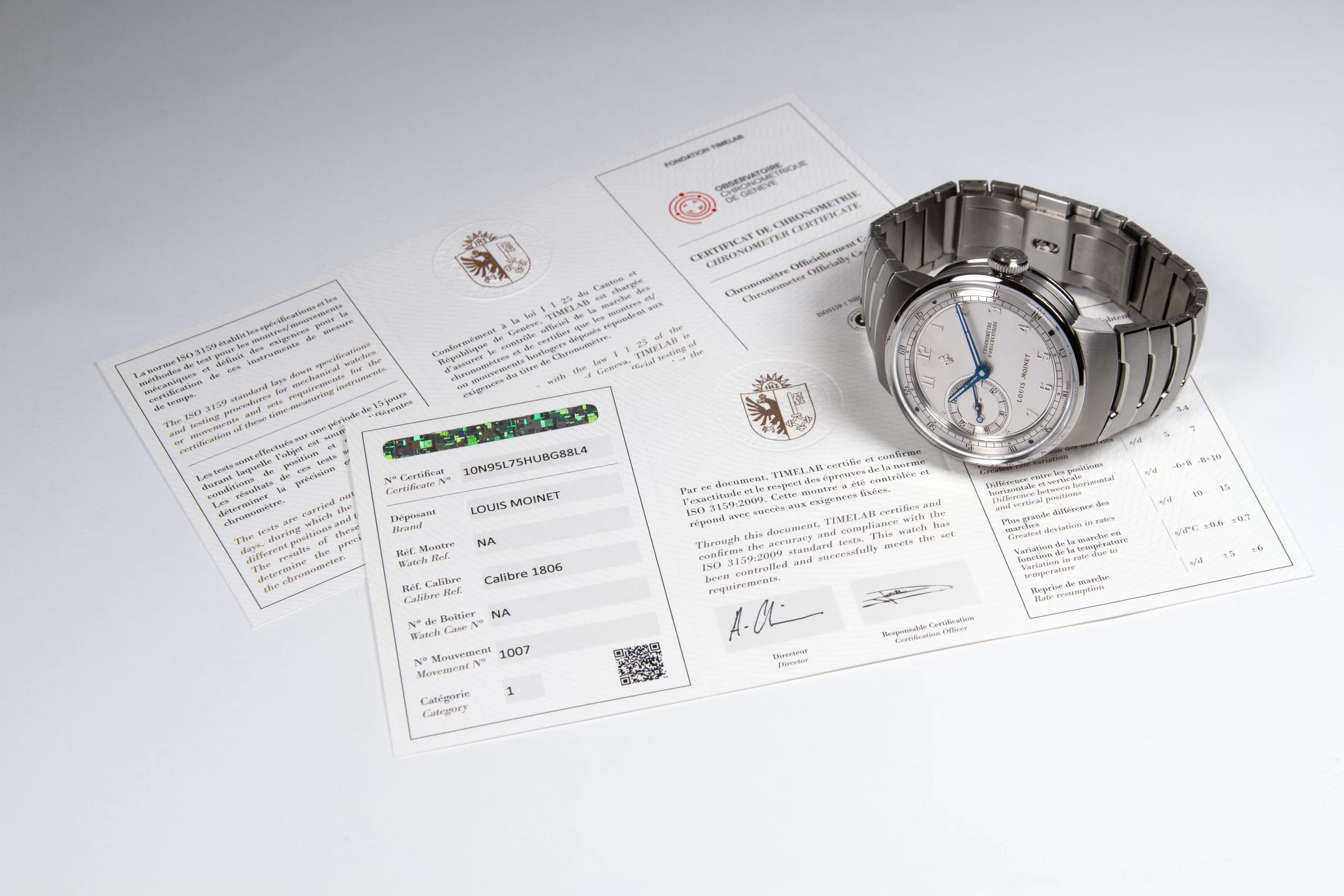 The new Louis Moinet timepiece, the 1806, has been certified as an observatory chronometer and is thus a part of that tradition. To obtain this designation, each 1806 movement undergoes fifteen days of trials, during which it is tested in different positions and subjected to various temperature variations. The results of these tests provide proof of the chronometer’s precision and reliability.