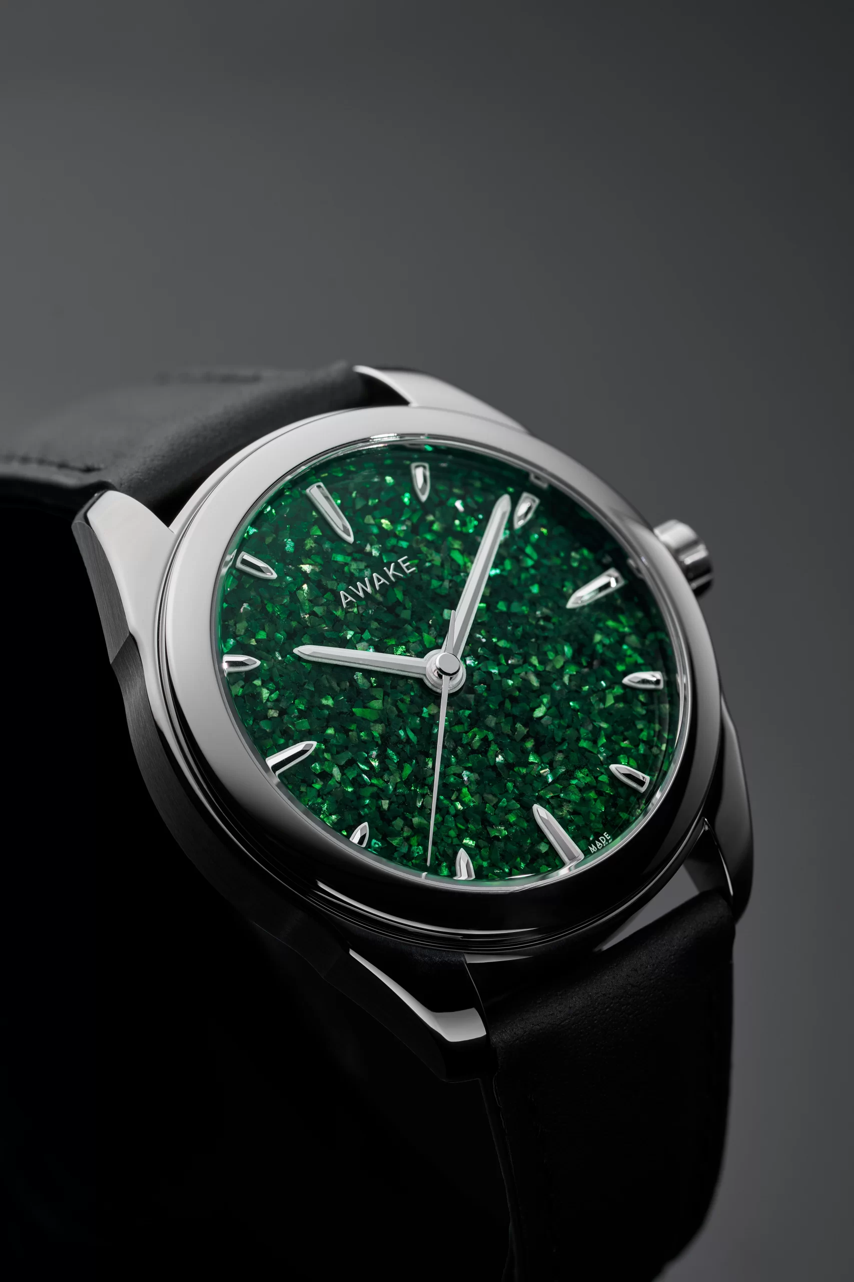 To extend the sensory dimension of the watch, AWAKE has partnered with Maison Jean Rousseau, an iconic figure in French leather goods. Each strap is handmade from calfskin leather and lined with Alcantara in colors that match the dials: forest green, midnight blue or purple. Suppleness, a velvety feel and tone-on-tone finishes are the hallmarks of the discreet elegance of an object designed to last. The straps are equipped with quick-release buckles and a recycled steel pin buckle, the result of complex machining. Because every detail counts, right down to the way the watch sits on the wrist.