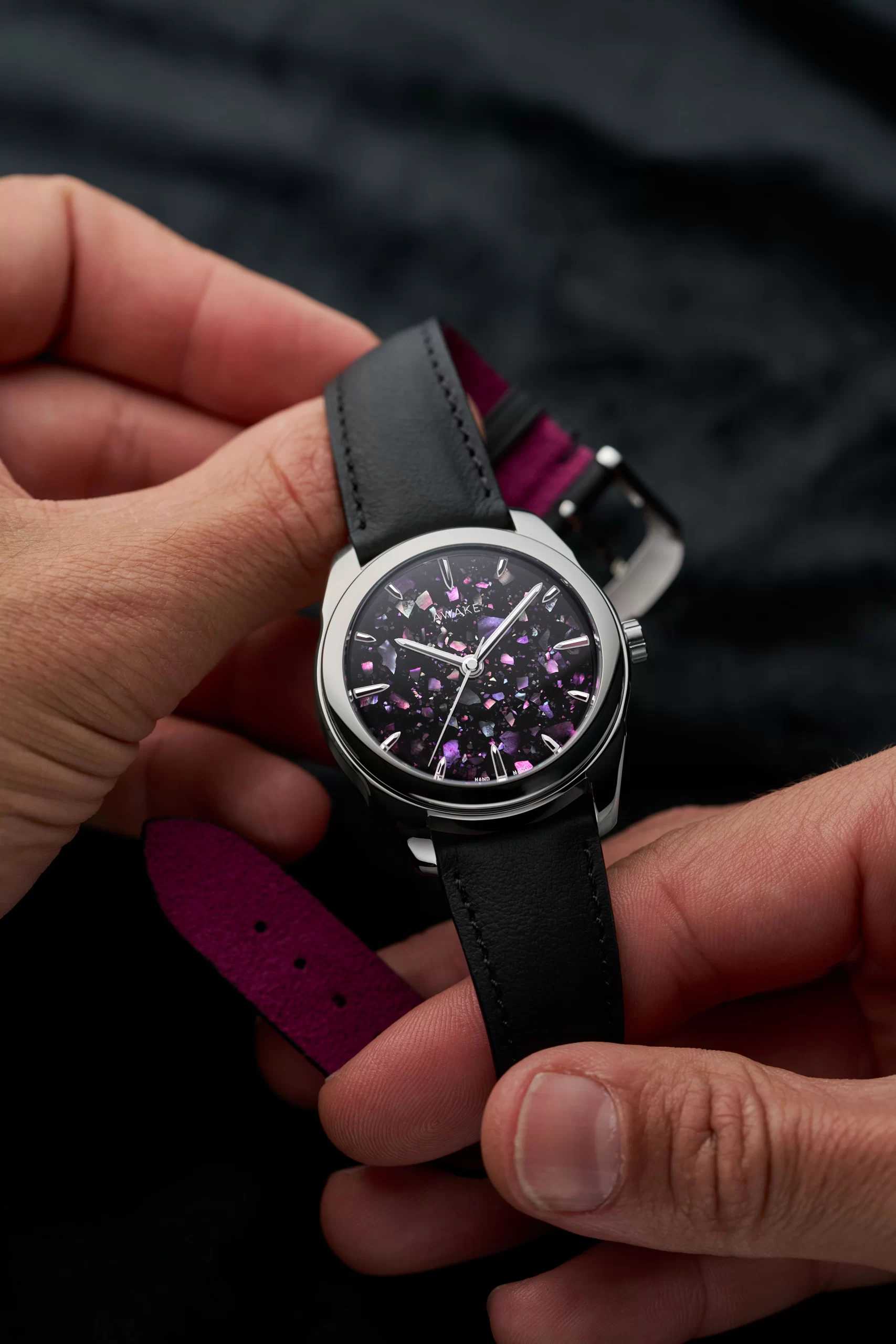 To extend the sensory dimension of the watch, AWAKE has partnered with Maison Jean Rousseau, an iconic figure in French leather goods. Each strap is handmade from calfskin leather and lined with Alcantara in colors that match the dials: forest green, midnight blue or purple. Suppleness, a velvety feel and tone-on-tone finishes are the hallmarks of the discreet elegance of an object designed to last. The straps are equipped with quick-release buckles and a recycled steel pin buckle, the result of complex machining. Because every detail counts, right down to the way the watch sits on the wrist.