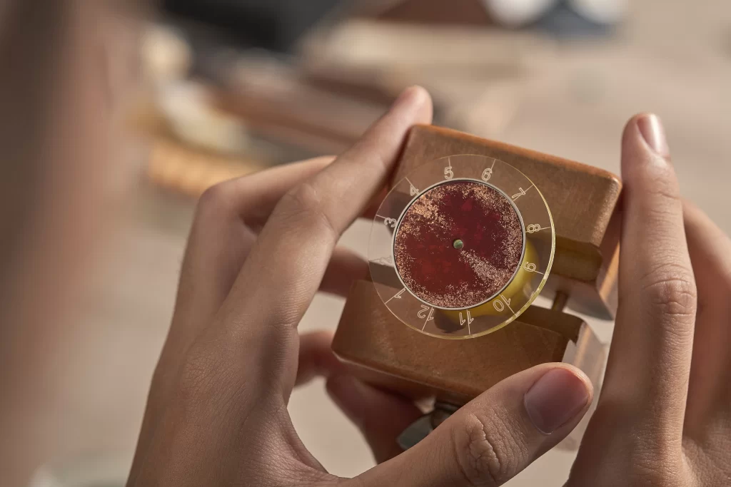 The entire process, demanding patience, dexterity, and extreme focus, transforms each dial of the Royal Red edition into a unique, living piece, where light and time seem to pause in order to resonate more vividly.