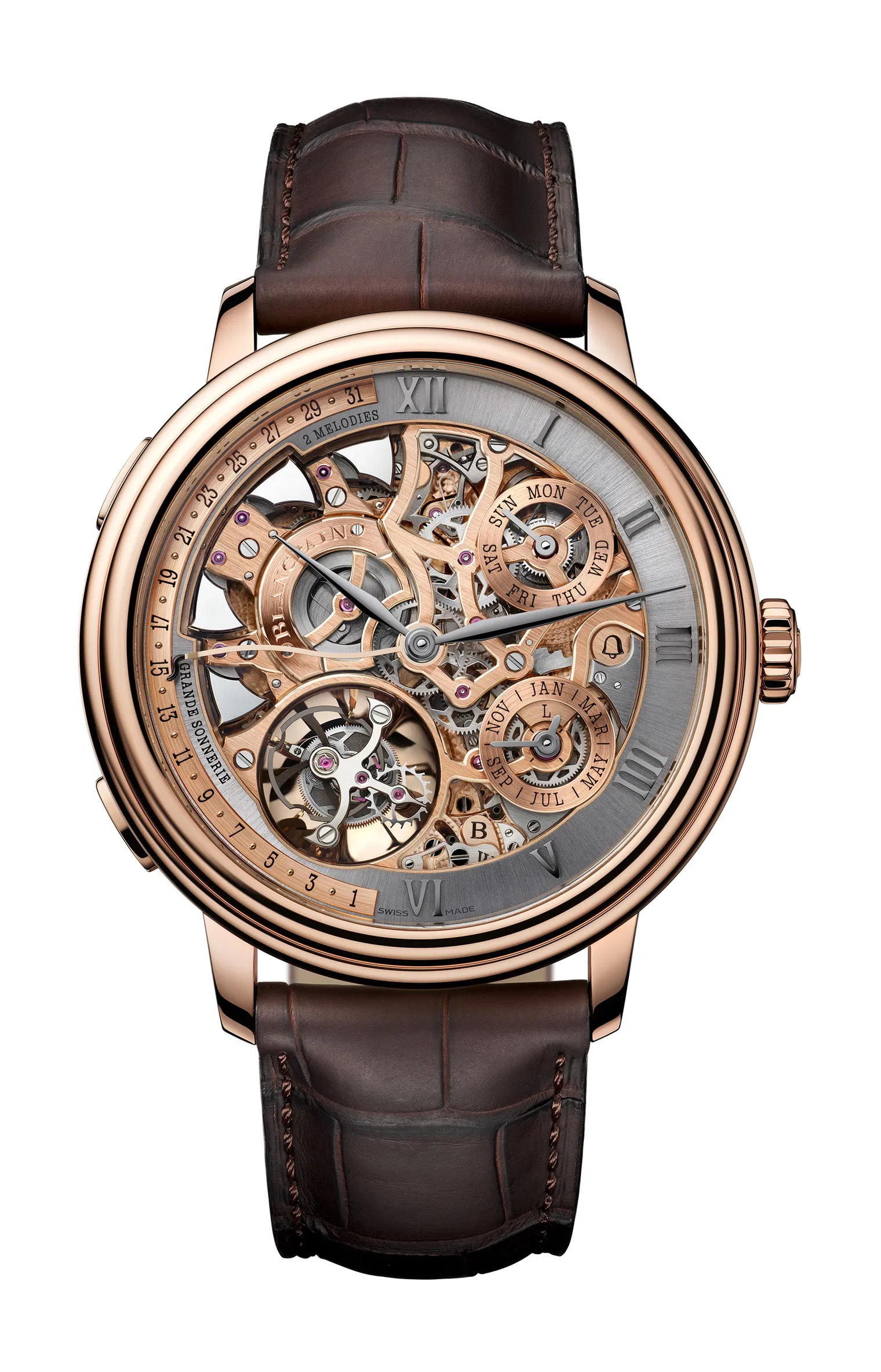 The Grande Double Sonnerie has so far been produced in red gold and white gold, with each case paired to a movement construction and finishing philosophy that complements its metal. This is not aesthetic coincidence, but intentional harmony—where case material, movement architecture, and acoustic behavior are considered as a whole.