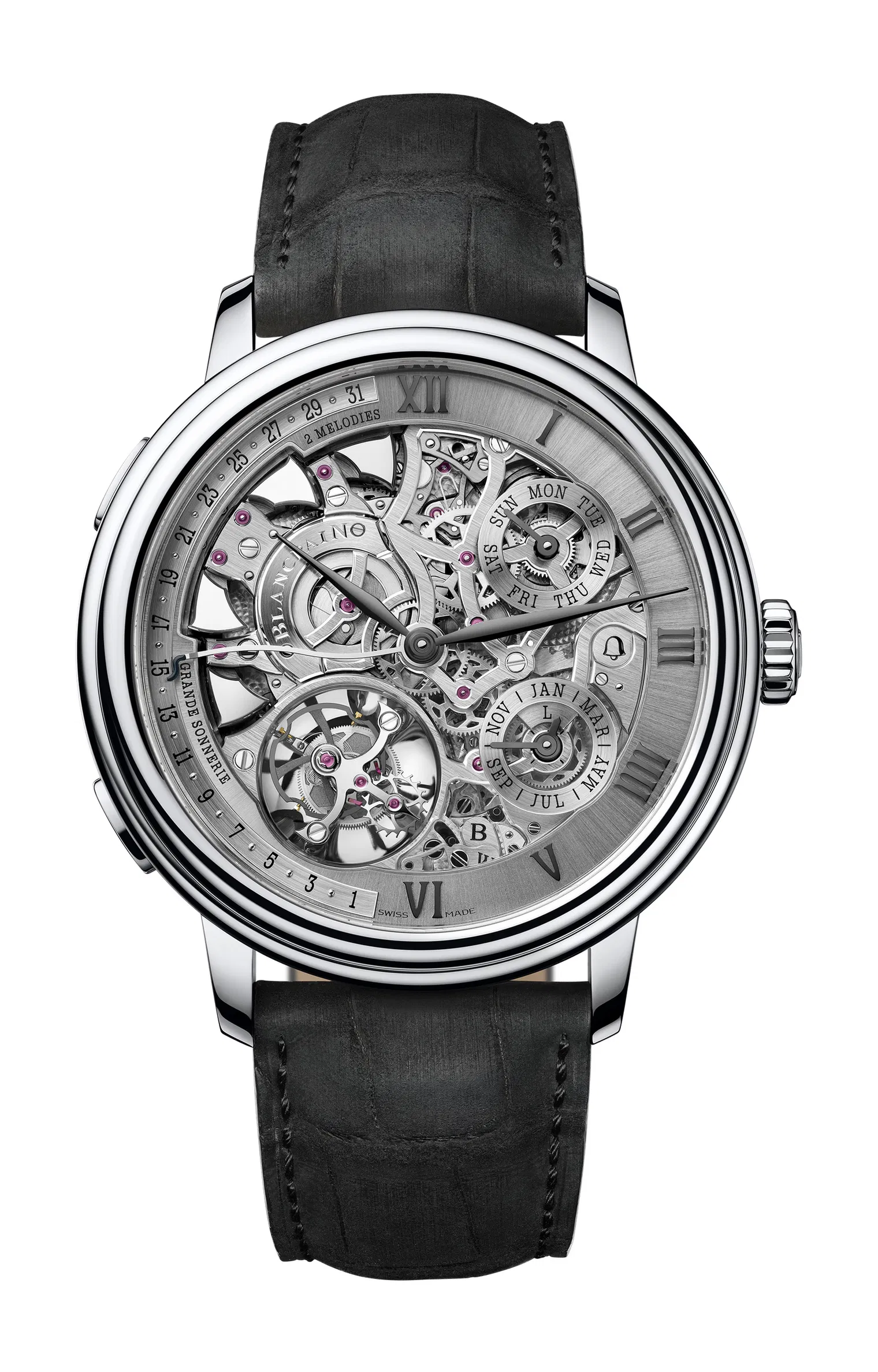 The Grande Double Sonnerie represents the technical summit of Blancpain’s modern history. Beyond its dual-melody chiming system, it integrates an extraordinary collection of complications into a single, coherent architecture: