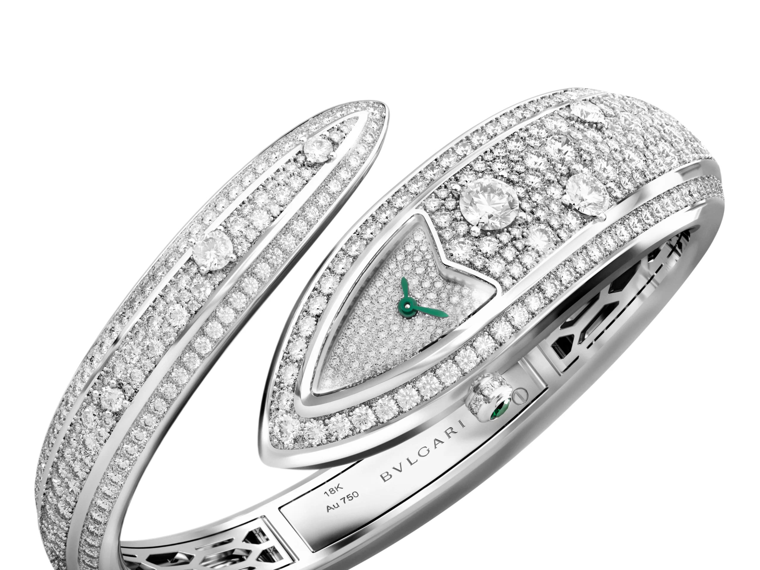 A white gold curve case, head and bezel set with round brilliant-cut diamonds. White gold crown set with diamonds and an emerald brilliant cut.