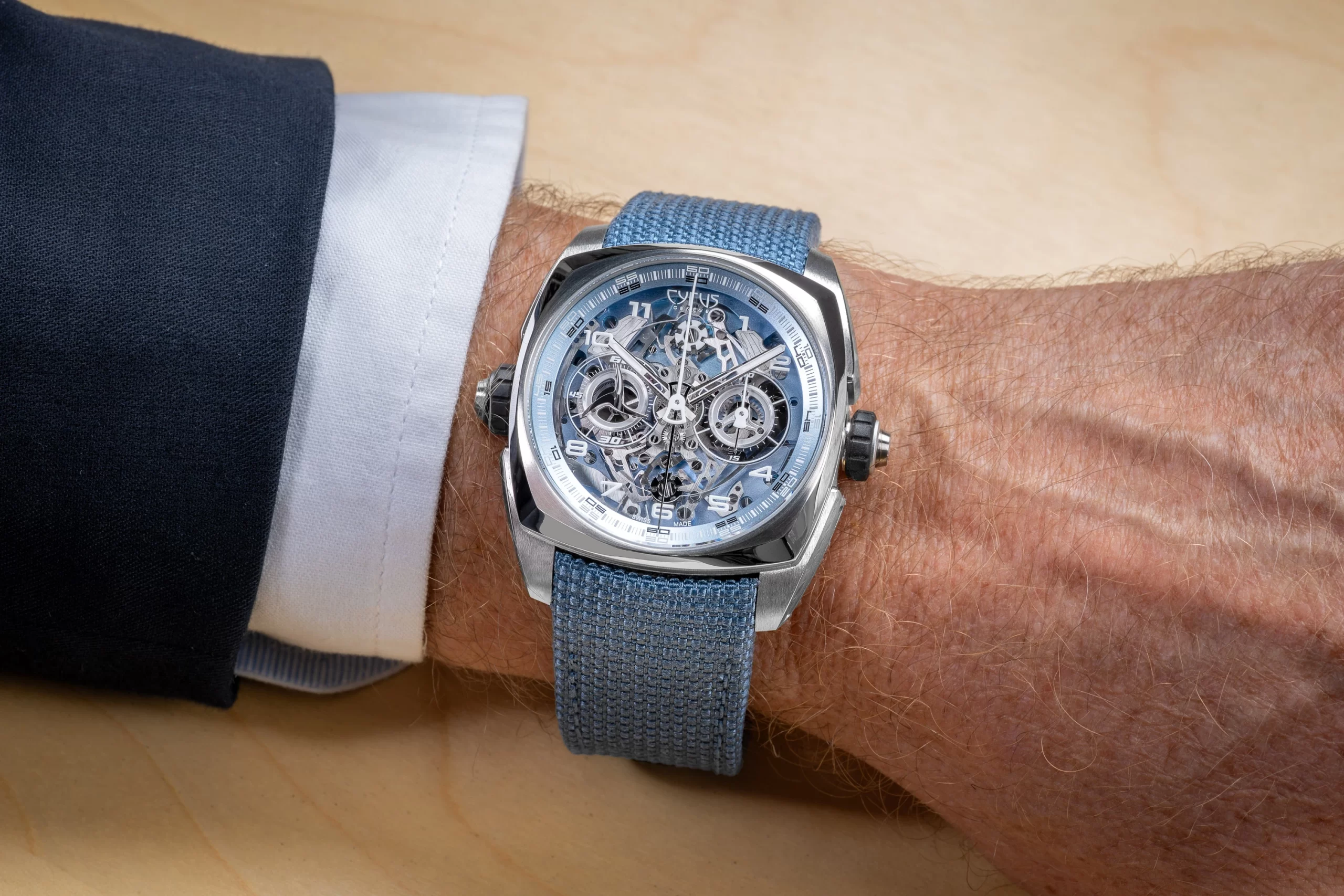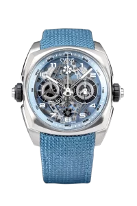 The openworked architecture of the display is a well-thought-out approach that allows the chronograph mechanism and its column wheels to be seen in action from the dial side, standing out against microblasted plates in the watch’s signature colour: a light blue obtained through ALD treatment.