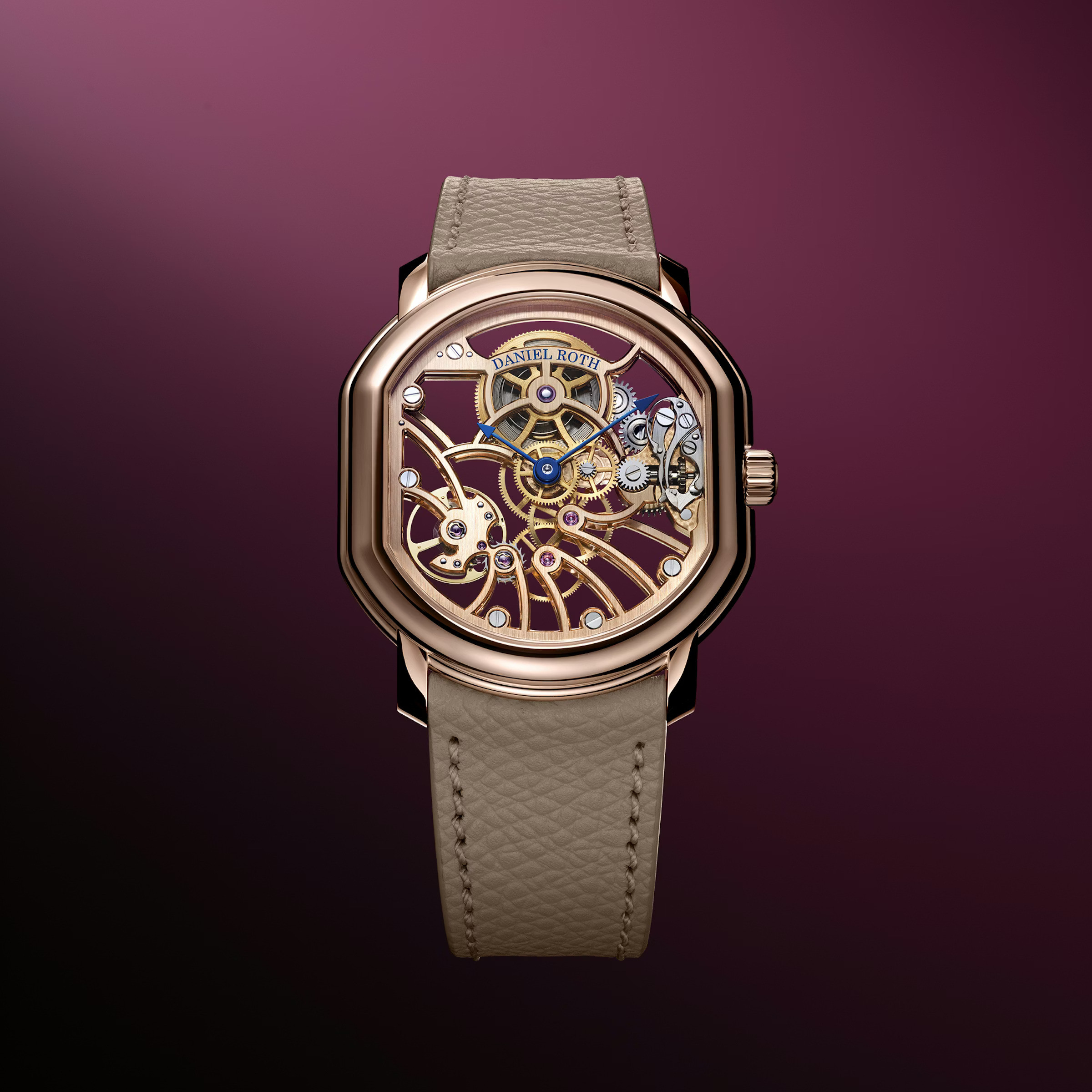 The Extra Plat Skeleton’s design remains true to Daniel Roth’s distinctive DNA: the elegant double-ellipse case shape, now measuring 38.6 mm x 35.5 mm with a remarkably thin profile of 6.9 mm. Crafted from 18k 5N rose gold, the case envelops the movement like a precious frame — warm, rich, and luminous.