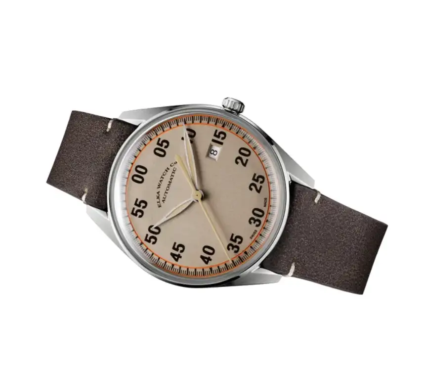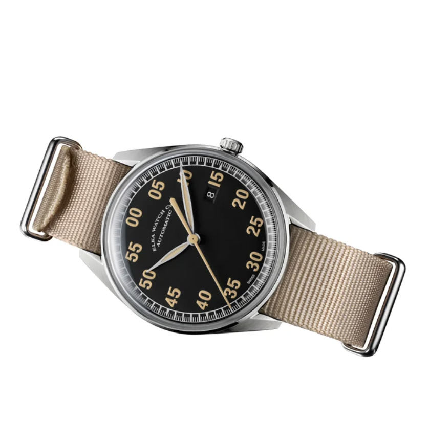 The timepiece to check out in the X series is the Elka X02. A sand-coloured watch that is inspired by the 60’s field watch design. The double numerals give it a very cool look. The X02 has only 2 orange lines in Super-LumiNova® and the numbers are painted in black.