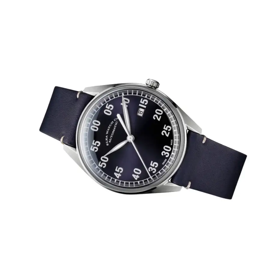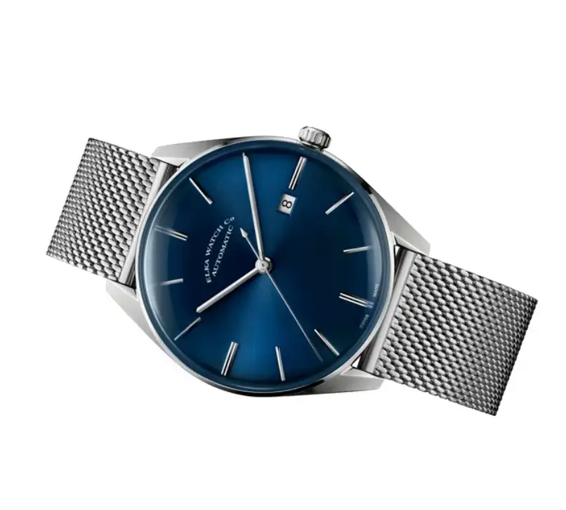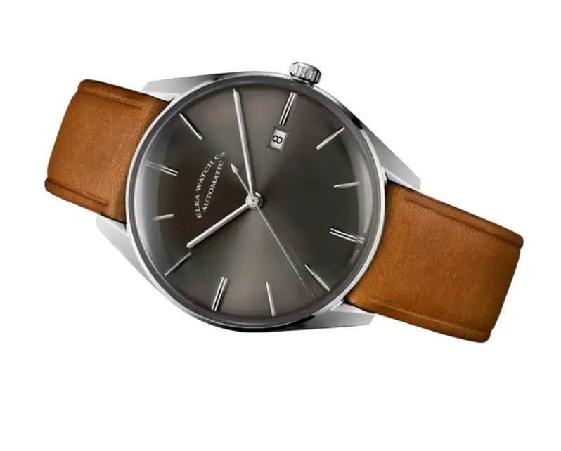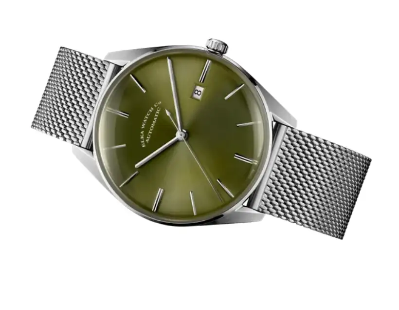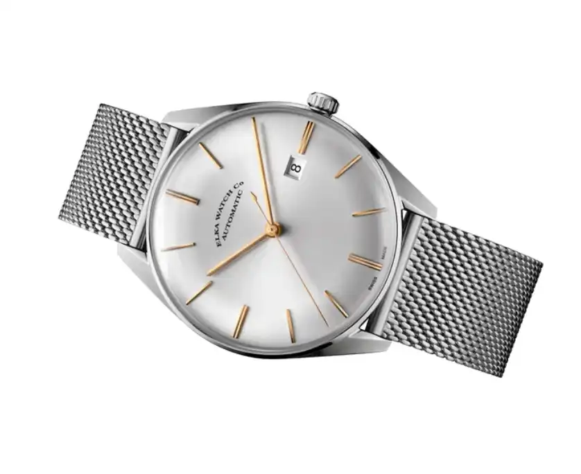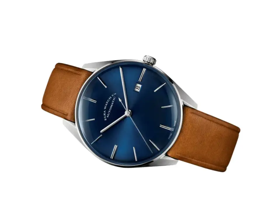 The dials of the Elka D series now have a sun-brushed finish with baton markers as accents. The date is at 3:00 hour marker. The short curved lugs angling downward make the watch visually intriguing.