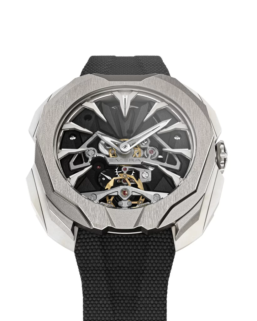 Conceived as a measuring instrument of ultimate performance, Sentinel embodies EMERA’s masculine, technical, and radically contemporary vision of haute horlogerie: angular architecture, tactical materials, surgical finishes, instinctive ergonomics — every element follows a functional logic, sculpted in pure precision.
