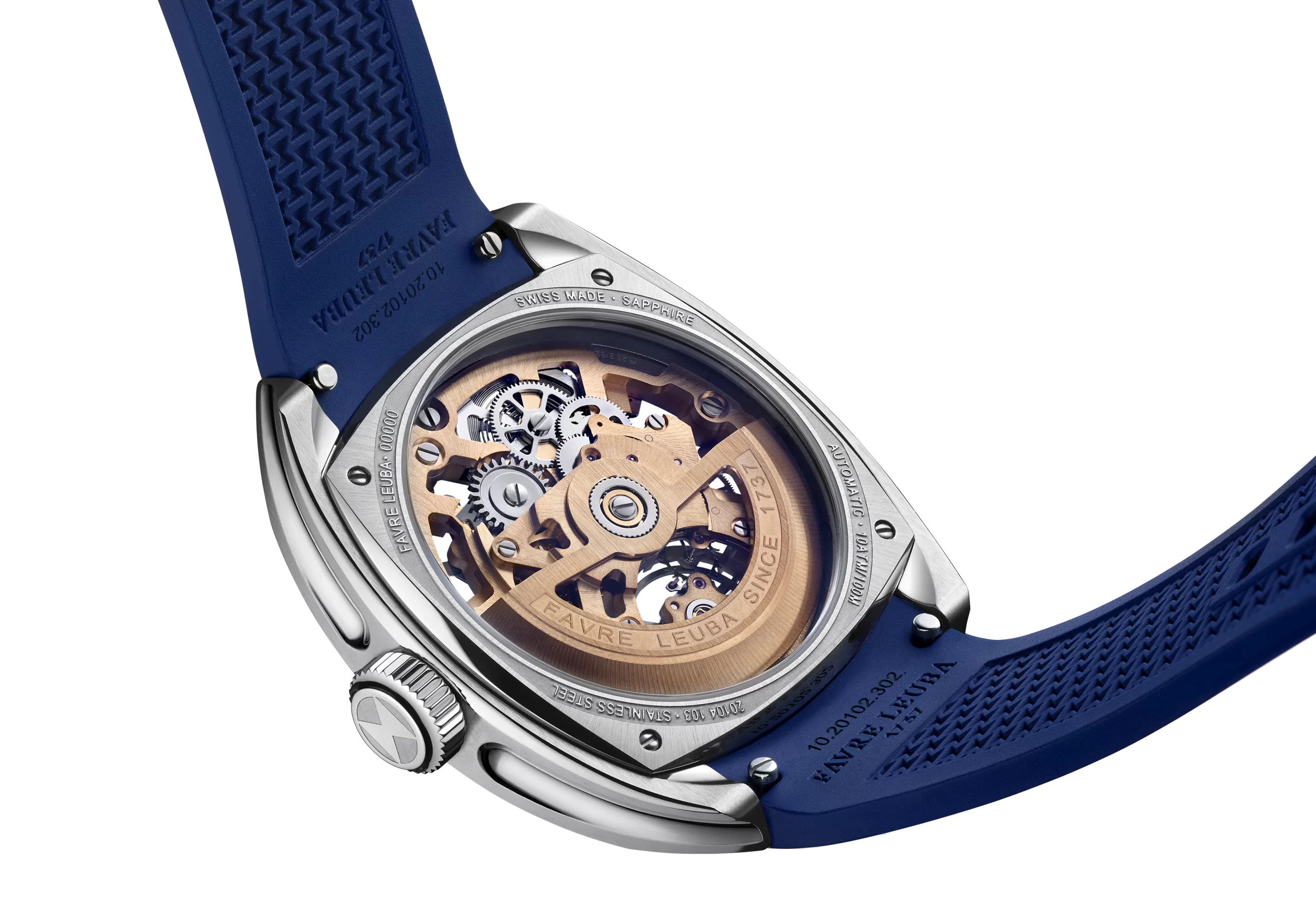 - Steel case with gold-finished movement – featuring either a green, blue, or black minute track, matched with a corresponding FKM rubber strap.