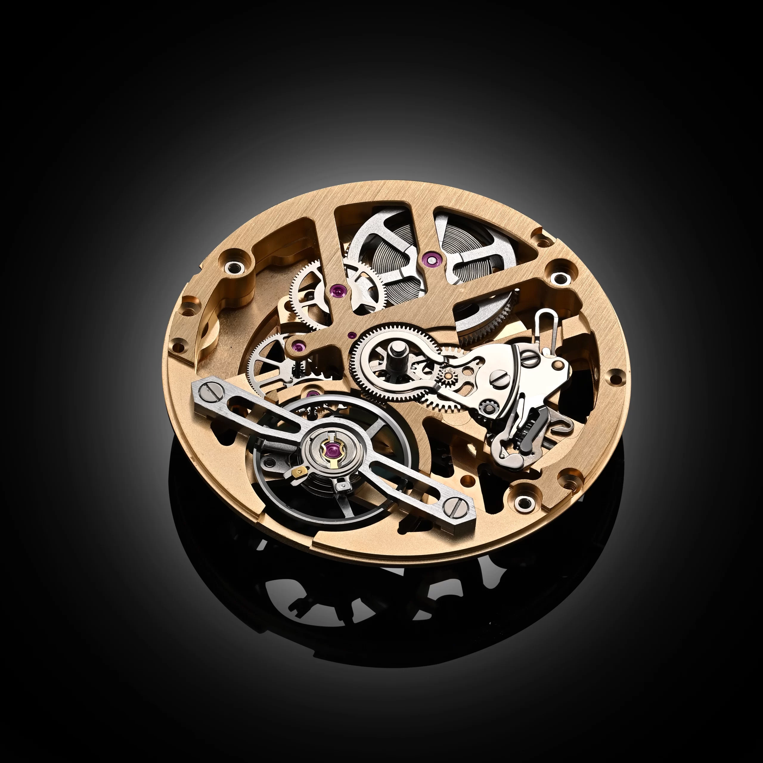 The custom-designed skeleton movement—finished in gold or anthracite—juxtaposes different textures, each contributing a distinct visual element. Snailing, a technique where a rotating tool creates a spiral pattern, adds a refined circular texture that enhances the movement’s depth and elegance. This intricate finish, along with satin and sandblasted surfaces, creates a dramatic visual display, drawing the eye to explore the openworked movement.