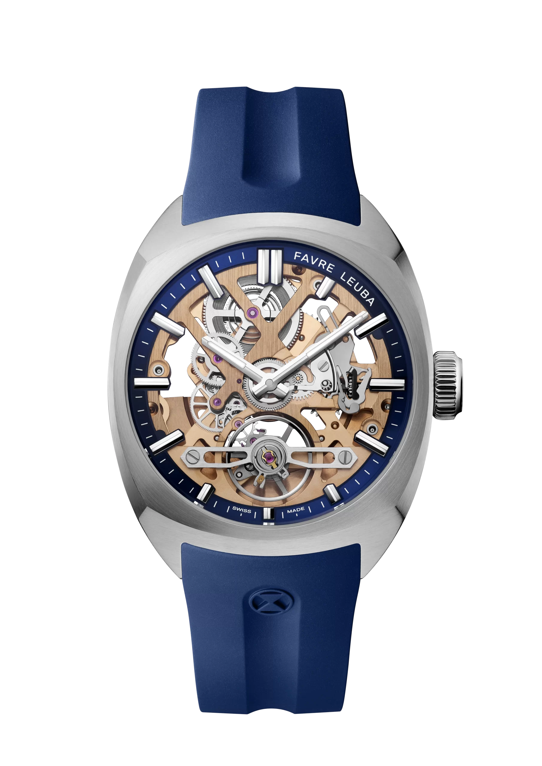 - Steel case with gold-finished movement – featuring either a green, blue, or black minute track, matched with a corresponding FKM rubber strap.