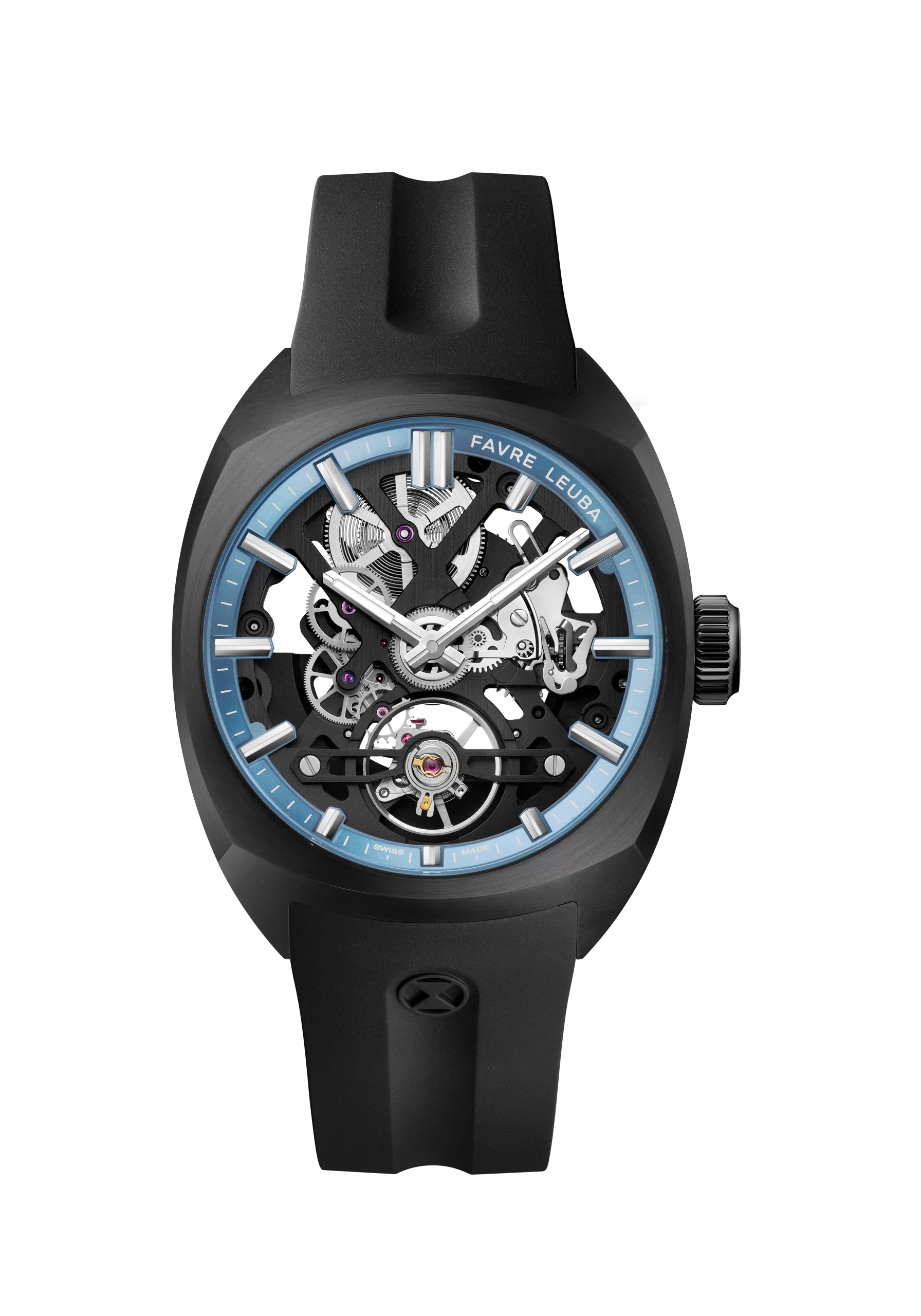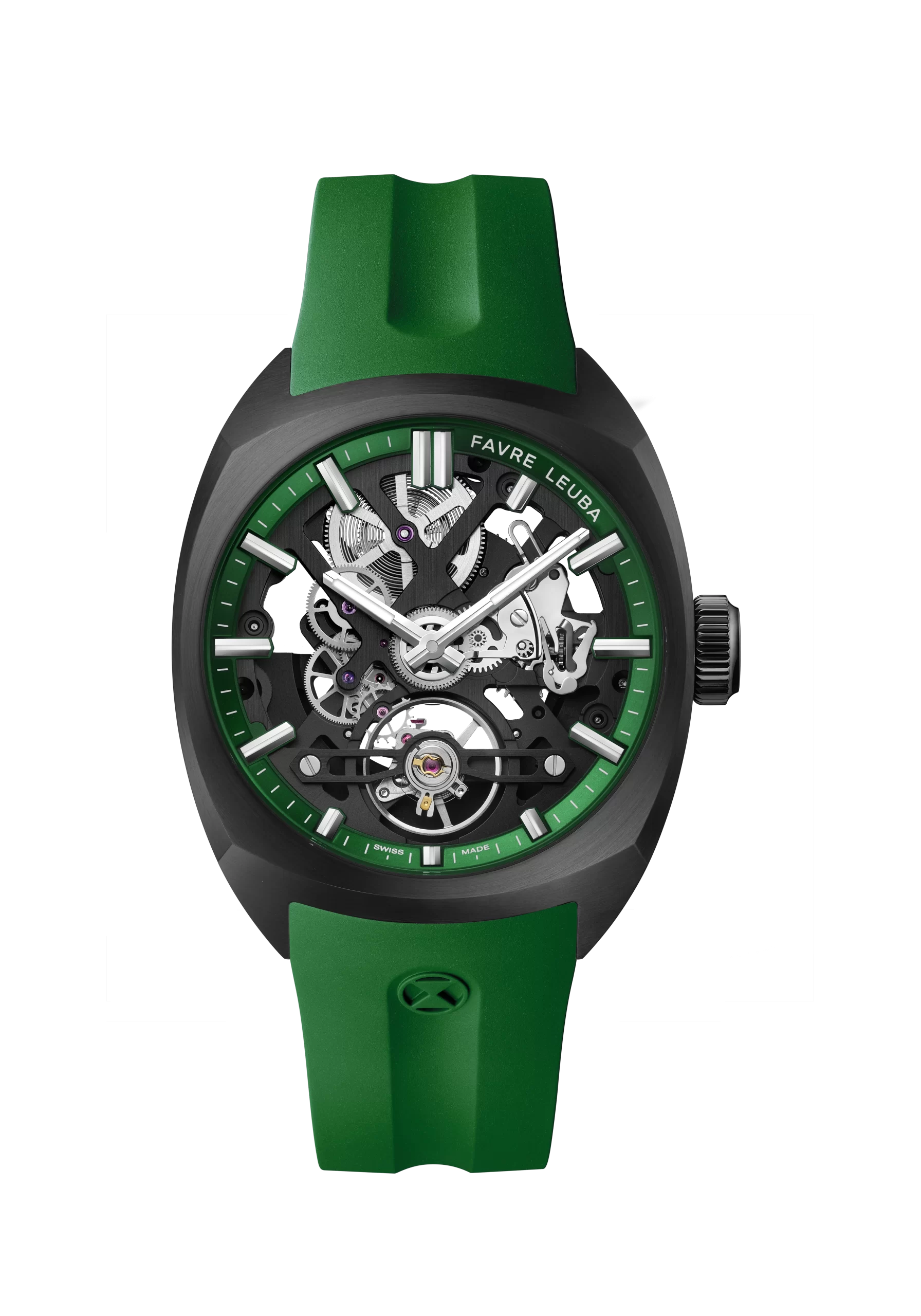 - Black DLC case with anthracite-finished movement – featuring either a green, blue, black, or ice blue minute track, matched with a corresponding FKM rubber strap.