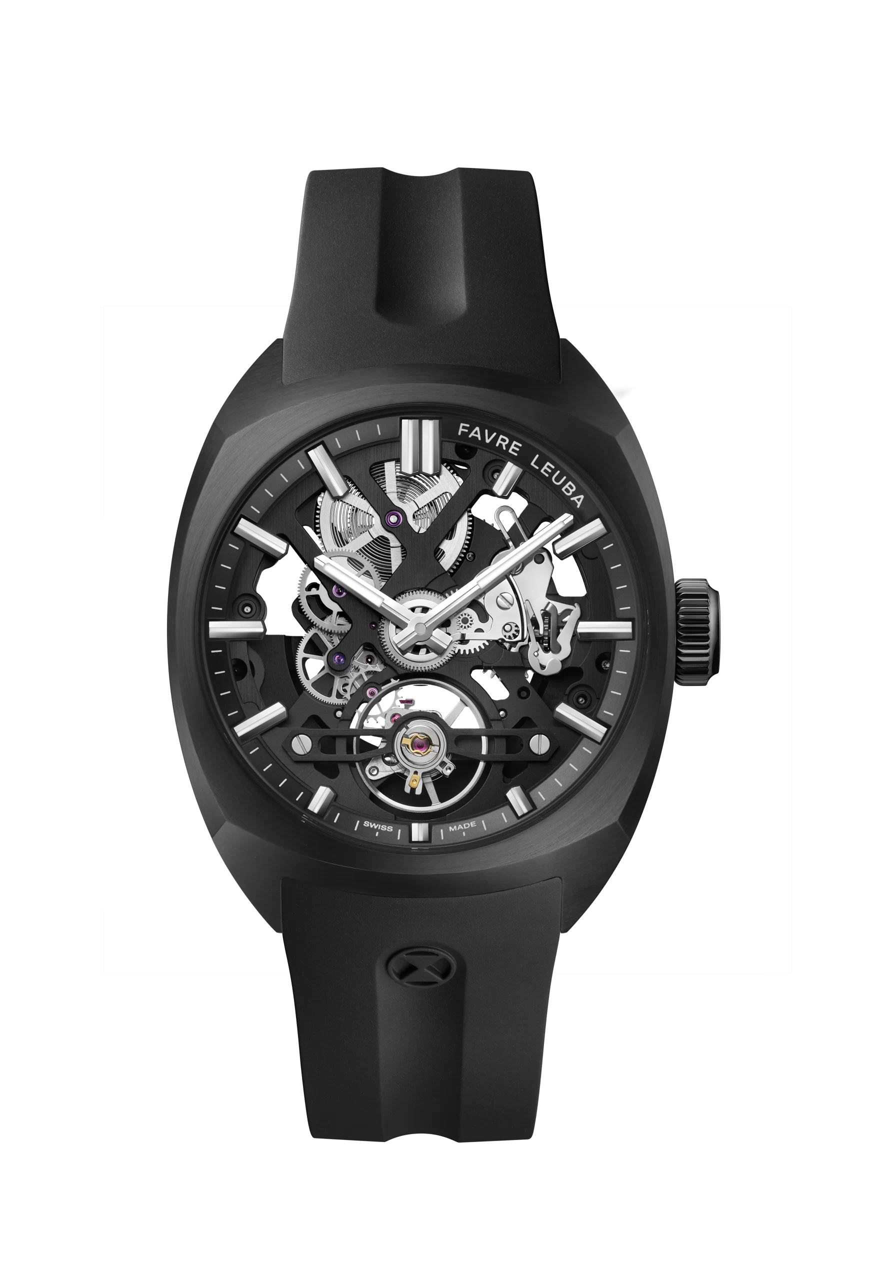 Operating at a frequency of 28,800 vibrations per hour, the movement provides a 41-hour power reserve. The skeletonized rotor features a satin finish and an engraved Favre Leuba wordmark. In the anthracite version, the rotor is coated with a matching black chrome (DLC) finish, creating a seamless visual connection with the case.