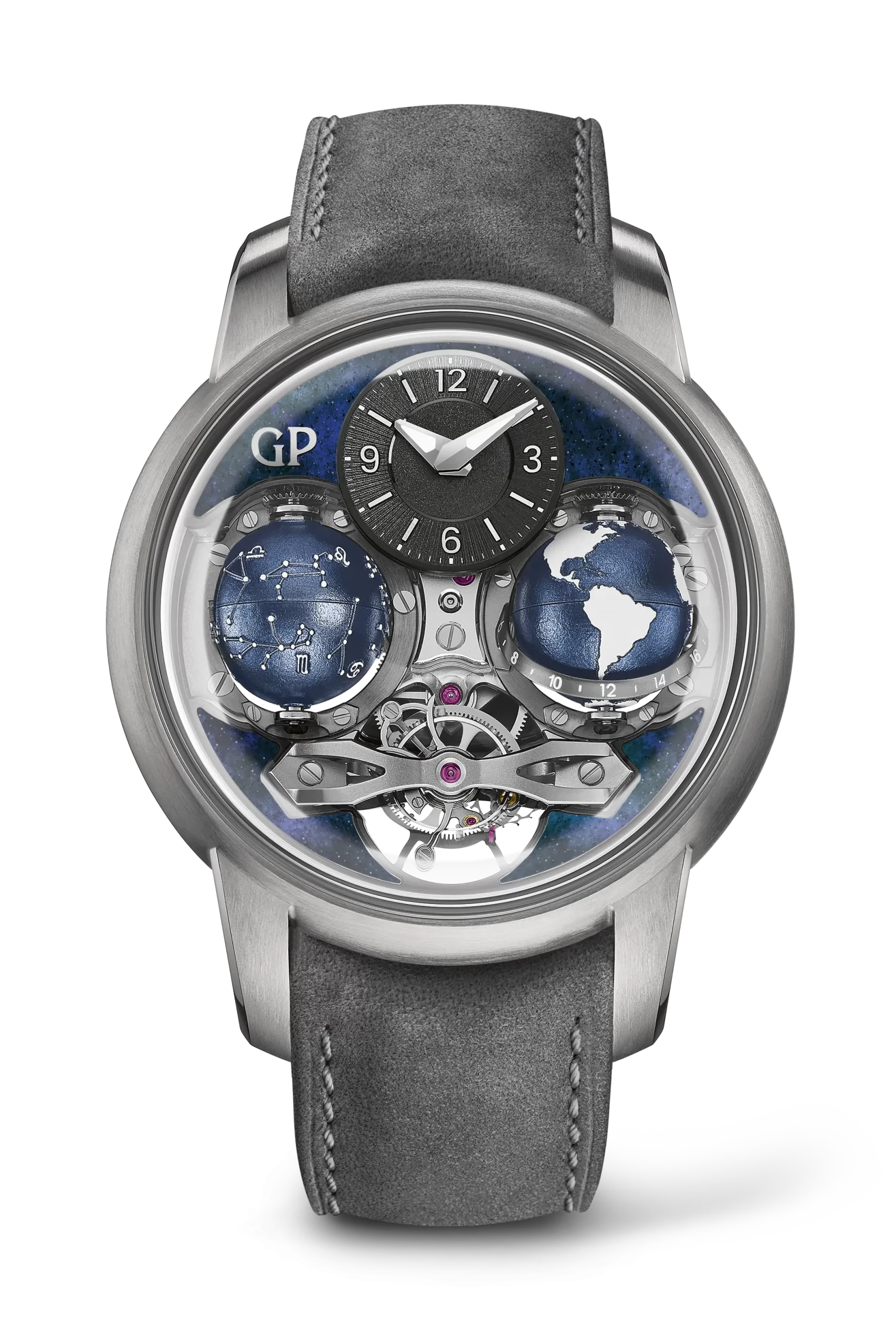 Powering the watch is the in-house Calibre GP09320, a hand-wound movement finished to the highest standards, featuring circular graining, bevelled bridges and a power reserve of at least 57 hours. Even the act of winding becomes an experience, thanks to four rotating bows (“bélières”) on the case back, replacing a conventional crown.