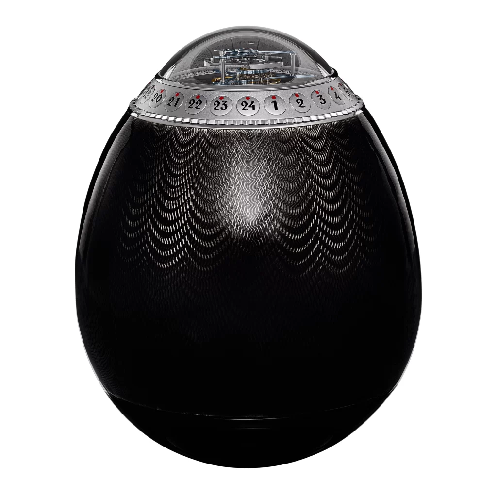 Anton Suhanov delivered one of the most poetic creations of the night. His tourbillon clock, shaped like a jewelled Easter egg, blends mechanical virtuosity with Russian artistic heritage. A stunning triumph for independent creators.