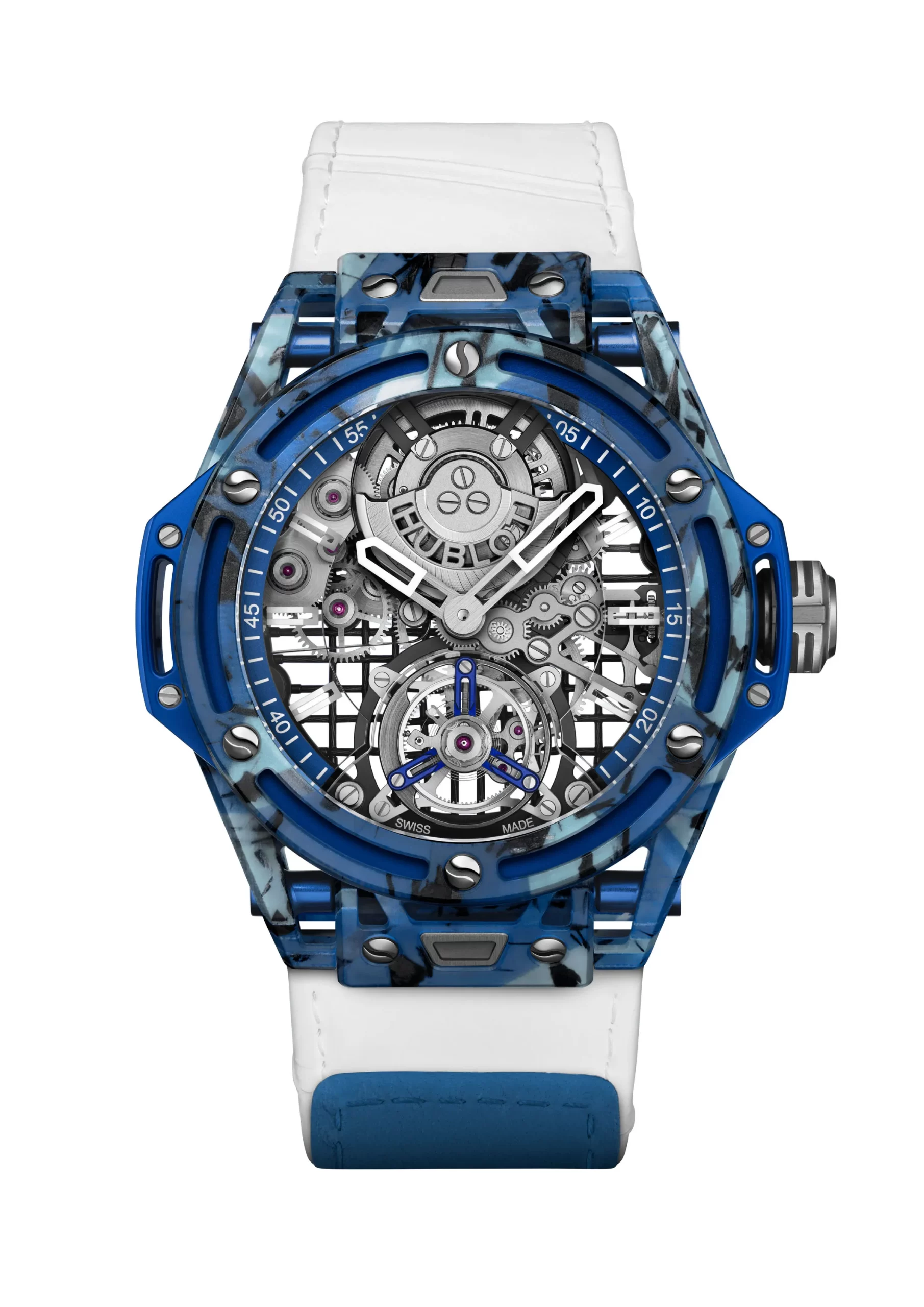 Further elegant touches include the mouvement’s aluminium tourbillon cage, which has been anodized in either blue, orange or green to match the case color. At 12 o’clock, the watch’s rhodium-plated, 22-carat red gold micro-rotor is machined and laser-engraved to reveal the Hublot logo. The movement comprises a total of 293 components.