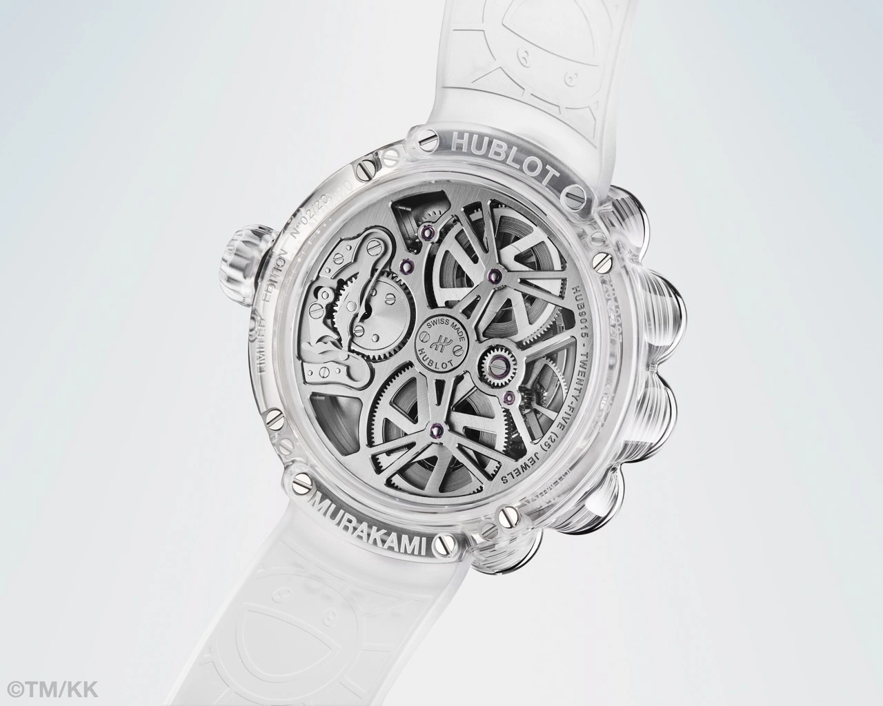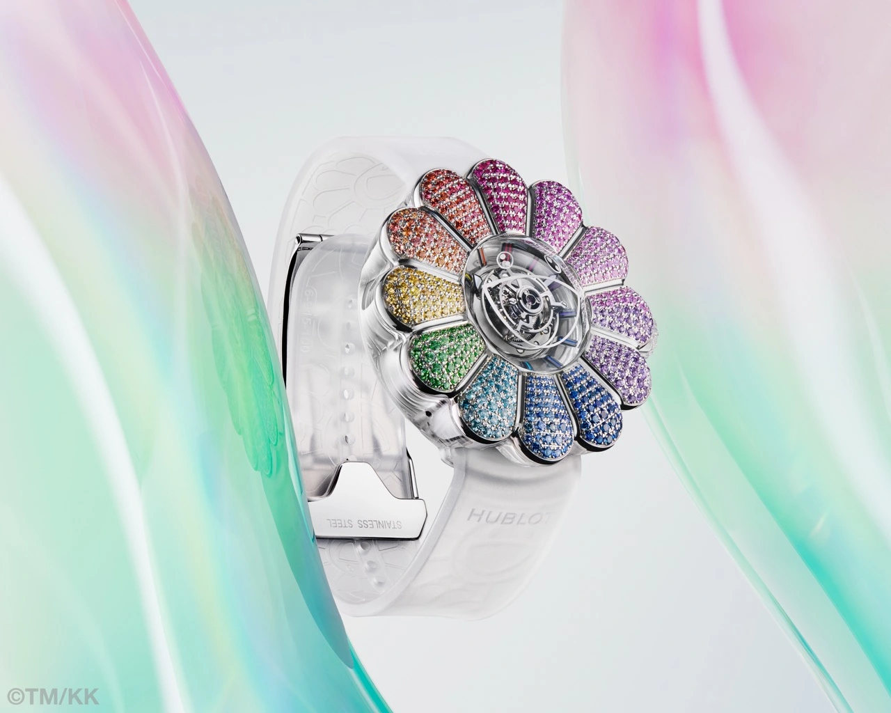 The finishing touch comes in the form of the strap, which is transparent and decorated with Takashi Murakami’s signature flower motif. Like the case, the deployant buckle is crafted in Sapphire crystal and Titanium.