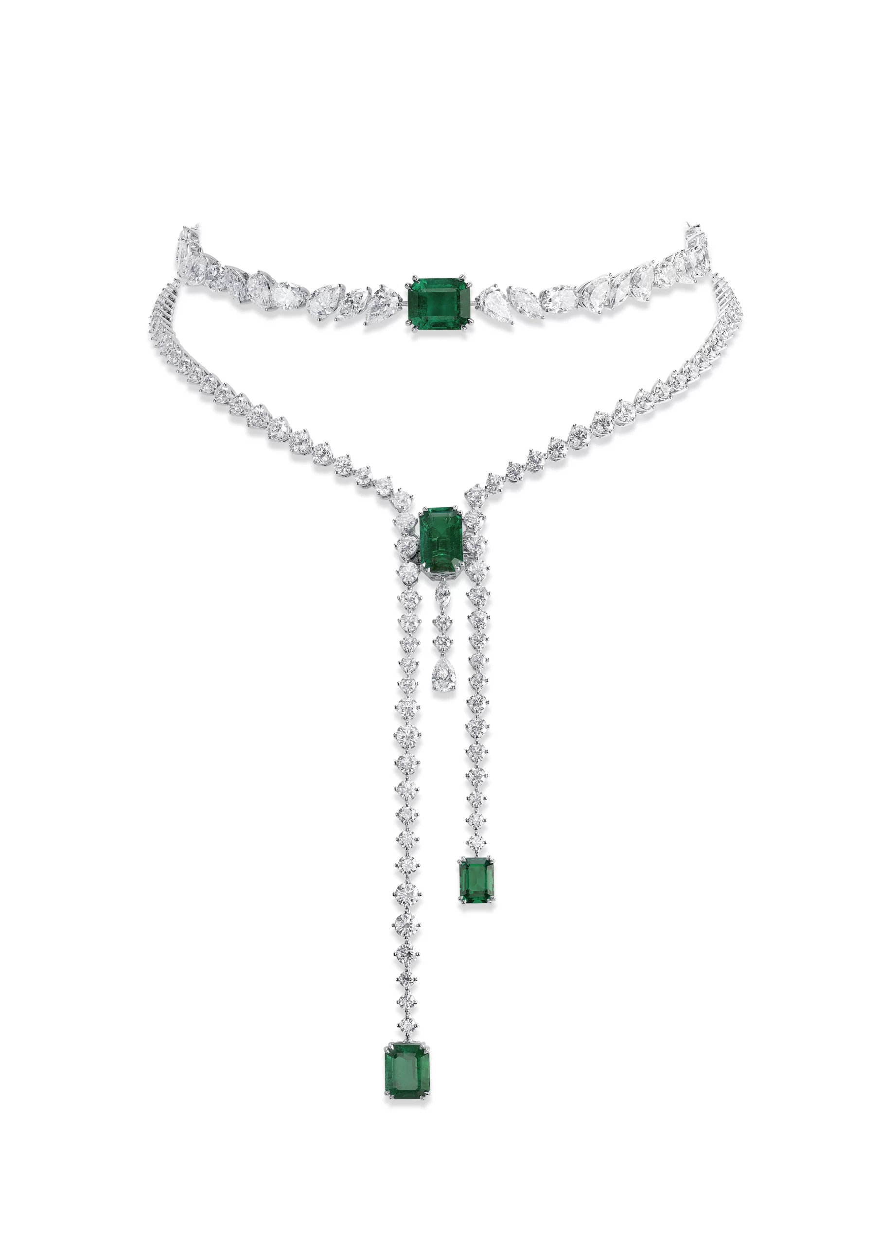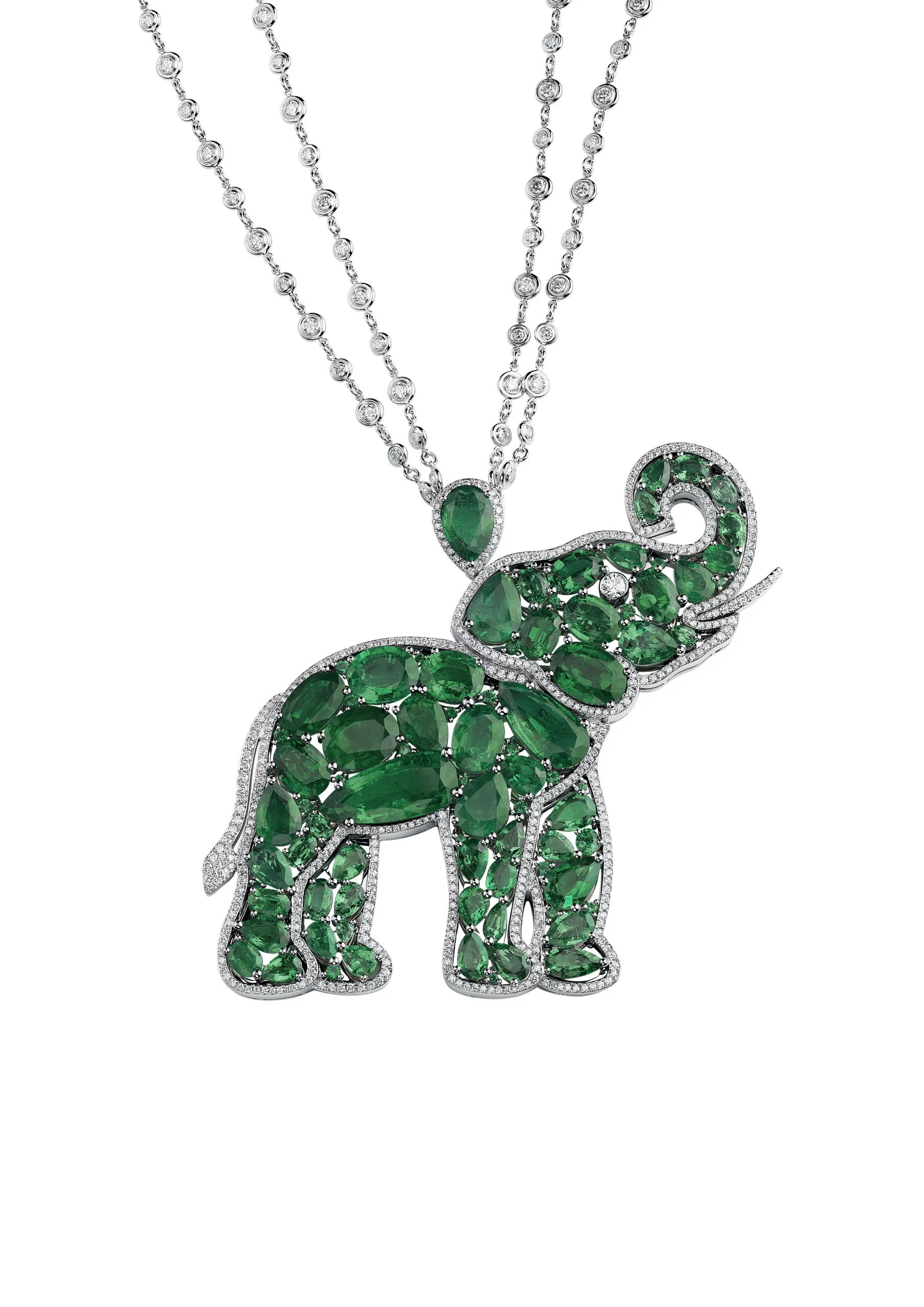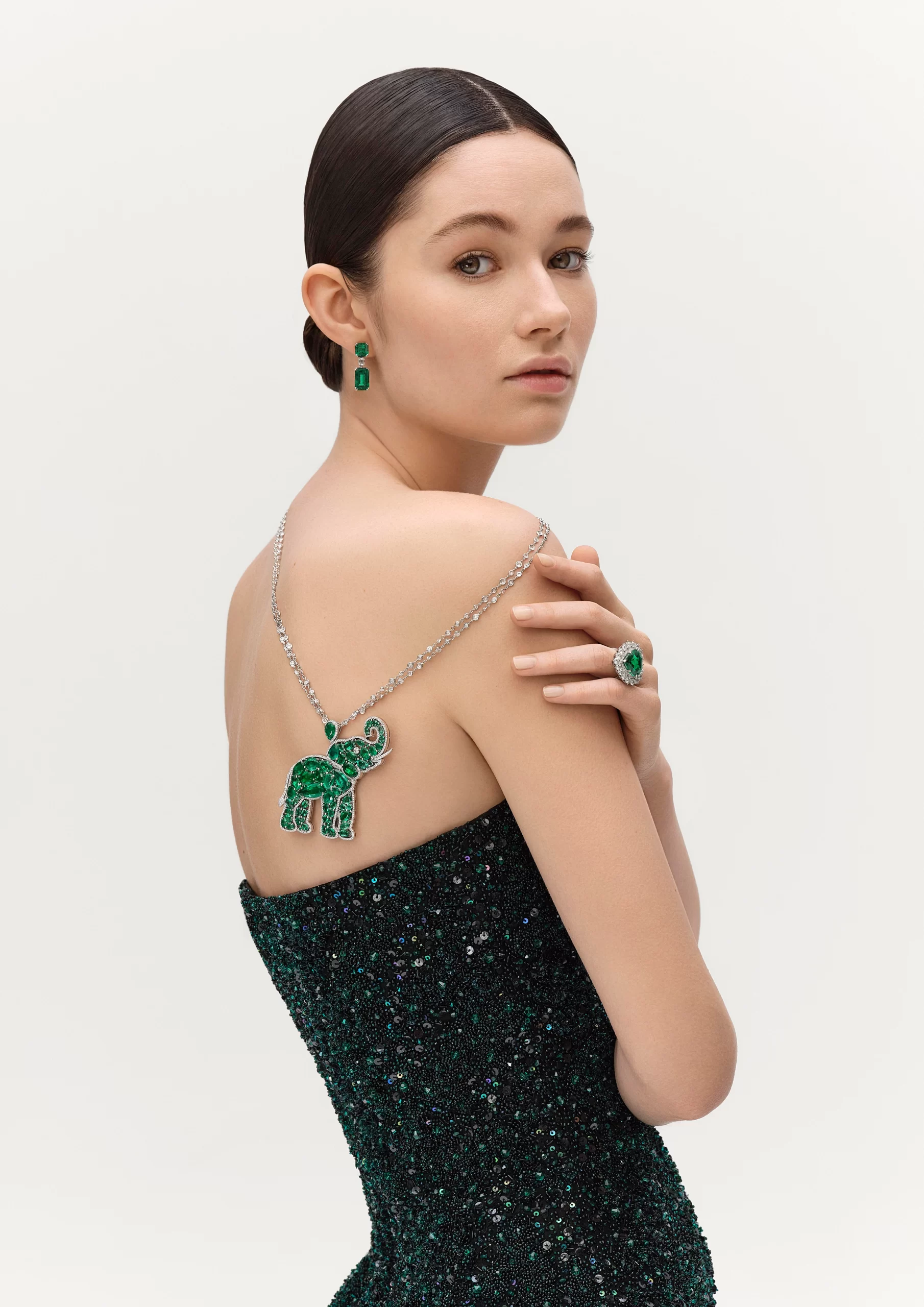 At the heart of the Collection is an elephant-shaped pendant – a tribute to the name Insofu. This signature piece features emeralds of various shapes and sizes, framed by shimmering diamonds that form the elephant’s tusks. It is suspended from a long chain interspersed with emeralds and diamonds. Notably, the elephant’s trunk is raised upward – a gesture replete with symbolism, representing prosperity and good fortune.