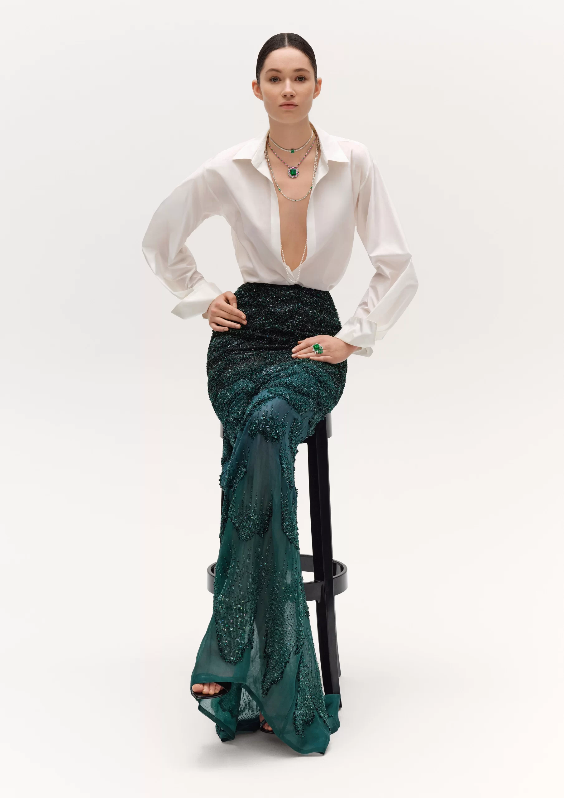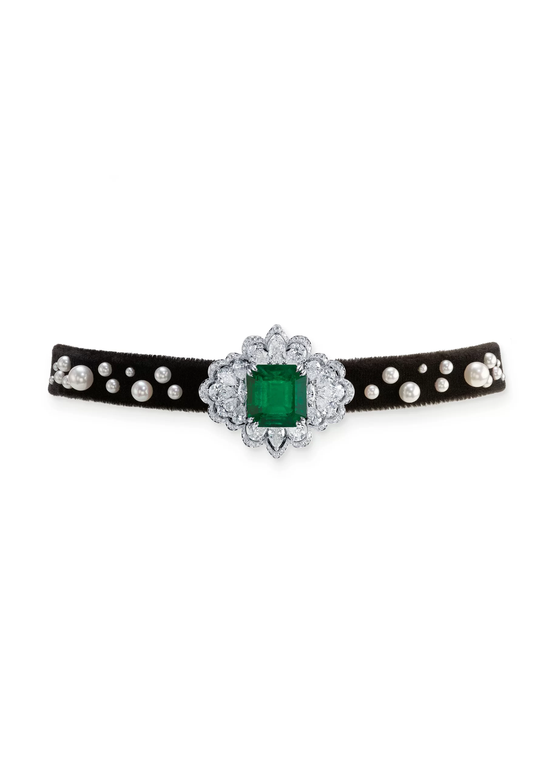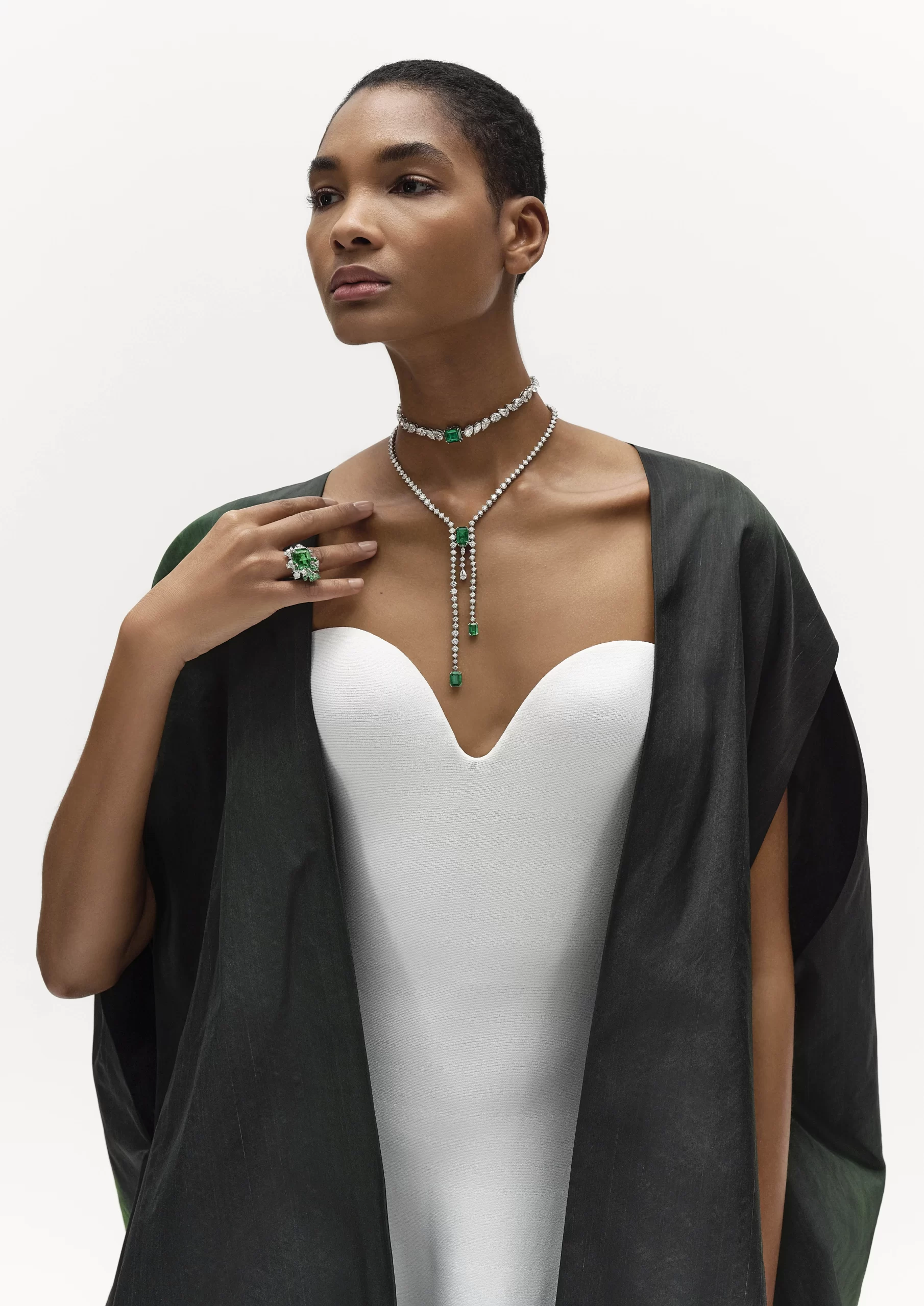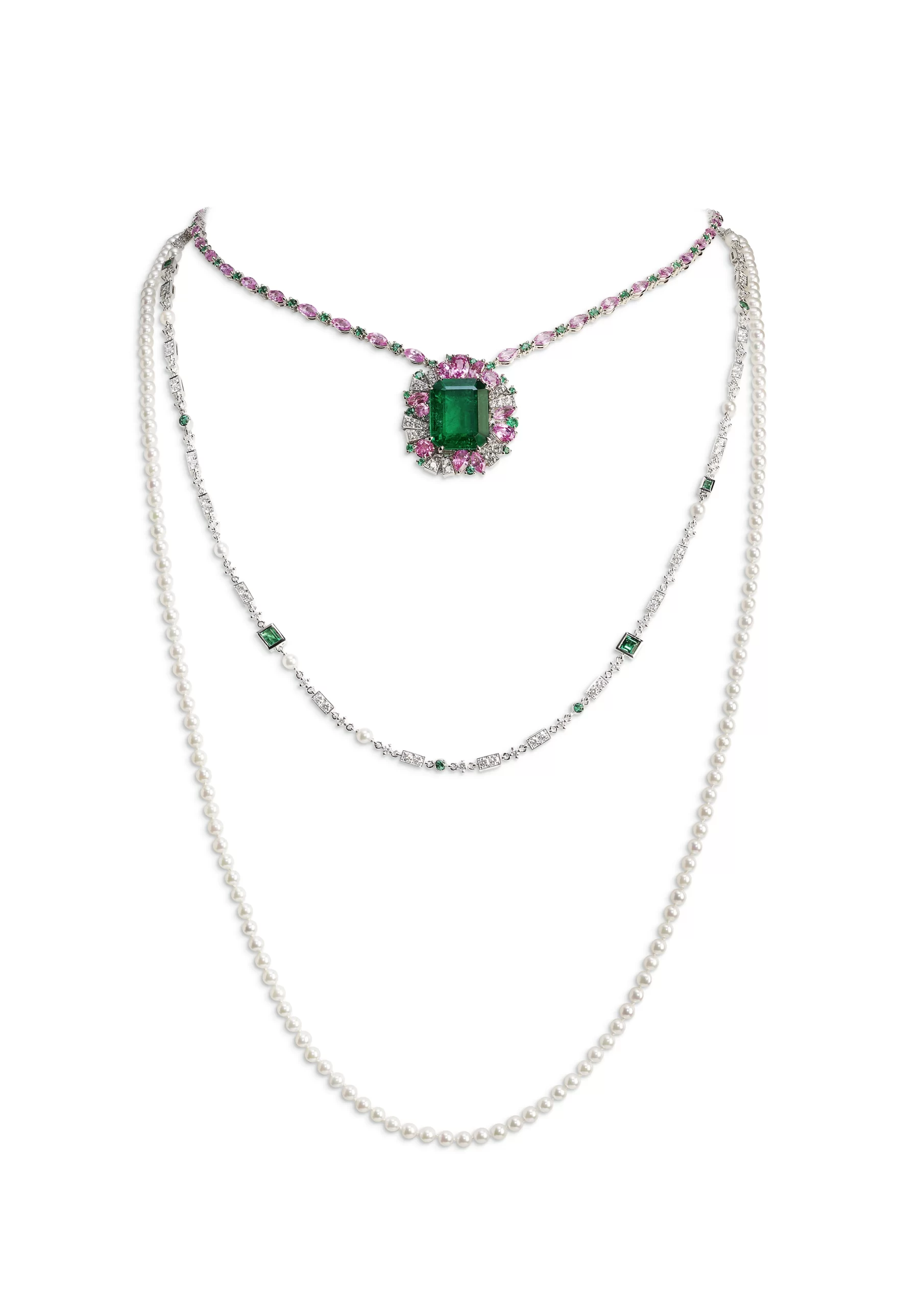The collection also includes elegant Art Deco-inspired chokers, flowing long necklaces almost grazing the waist, evoking the audacity of the Roaring Twenties, a statement cuff, imposing cocktail rings, and showstopping earrings. The extravagance of the era vividly depicted by Francis Scott Fitzgerald’s masterpiece The Great Gatsby (1925) is expressed through a one-of-a-kind ensemble of four necklaces, forming a singular set — endless possibilities for styling that celebrate personal expression. At its heart is a refined diamond choker, twinkling with a vibrant 2.50-carat square-cut emerald. This is elegantly complemented by a second necklace festooned with pink sapphires and emeralds, holding an extraordinary 15.53-carat octagonal emerald. Bringing an element of fluidity to the set, a long necklace interlaces emeralds, pearls, and diamonds, creating a captivating harmony of textures and colours. A delicate sautoir of pink pearls adds a touch of softness to this remarkable set and perfectly balances out the bolder pieces.