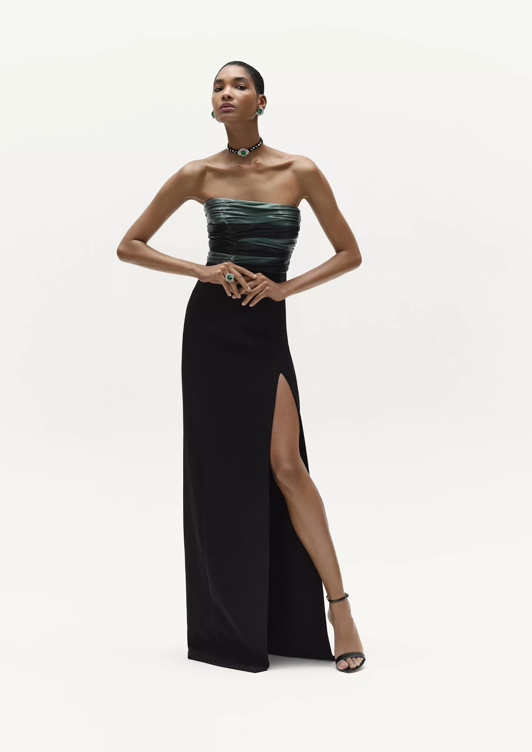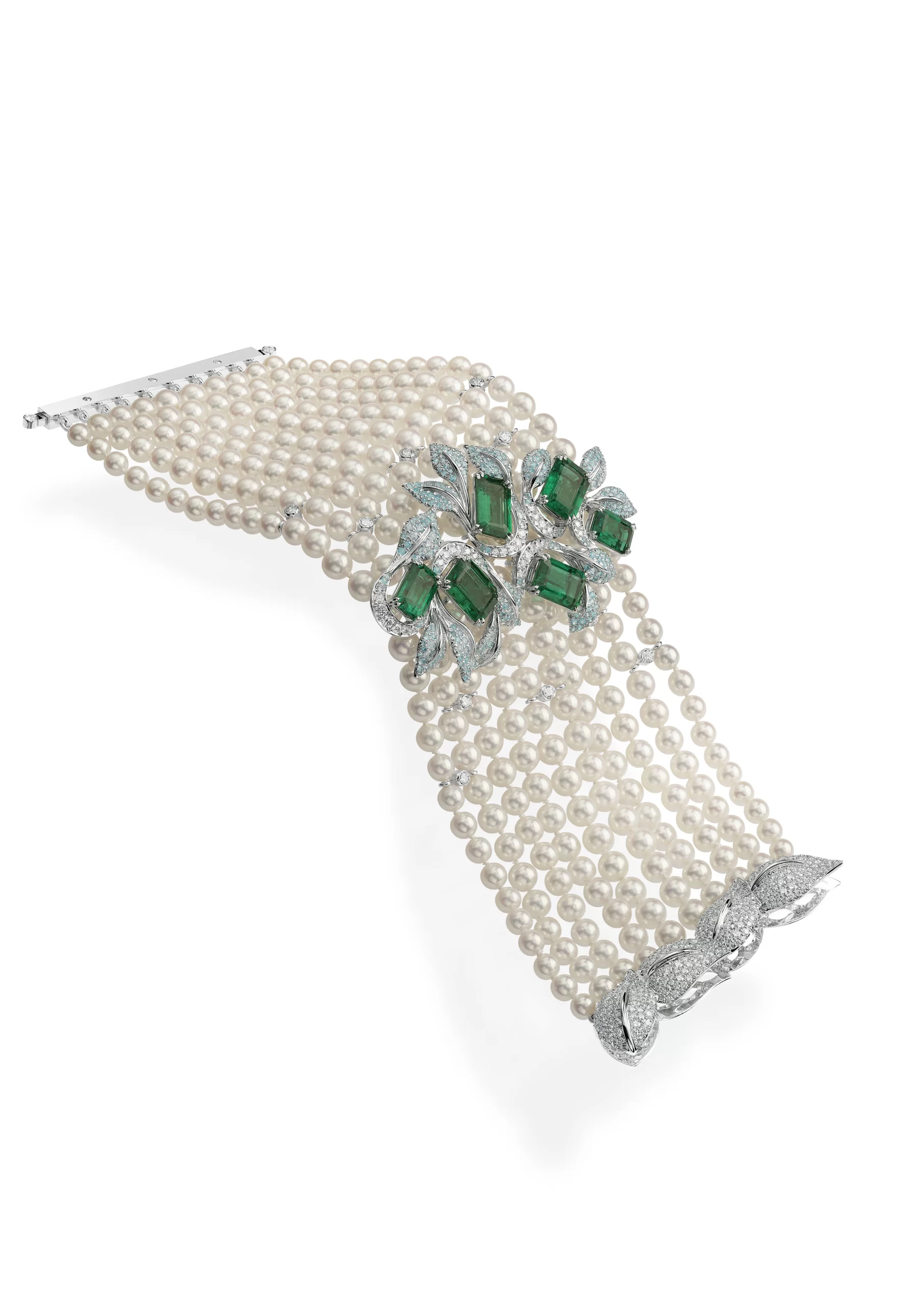 Against a backdrop of tightly woven pearls, a vertical motif of emerald-studded foliage gracefully weaves through a statement cuff, delicately embracing vibrant emerald-cut tsavorites. The smooth, soft, rounded pearls juxtaposed against the sharp facets of the stones create a refined interplay of textures and forms. The design elegantly unites the sea, embodied by the pearls, and the earth, represented by the verdant leaves. Together, they recall the symbiosis of these two realms of nature.