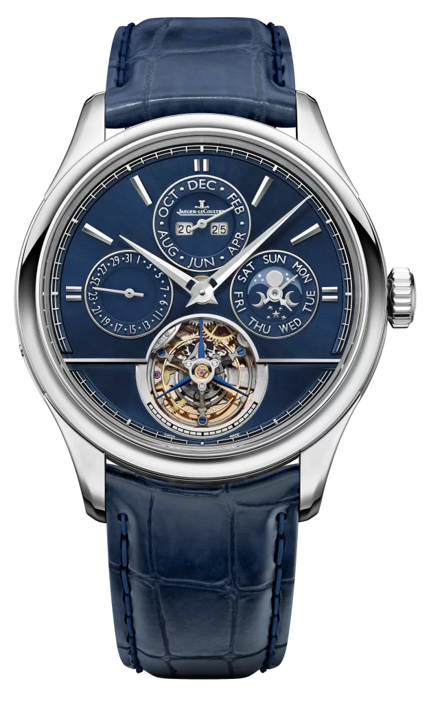 Jaeger-LeCoultre continues its pursuit of precision in mechanics and aesthetics with three new interpretations of the Master Grande Tradition Calibre 985. Two are cased in Platinum (950/1000) with an eye-catching blue dial, one with a polished bezel and one with a diamond-set bezel, and the third is cased in 18k pink gold (750/1000) with a brown dial. Developed in 2013, Calibre 985 unites a perpetual calendar and moon phase display with the fascination of a flying tourbillon equipped with a cylindrical hairspring.