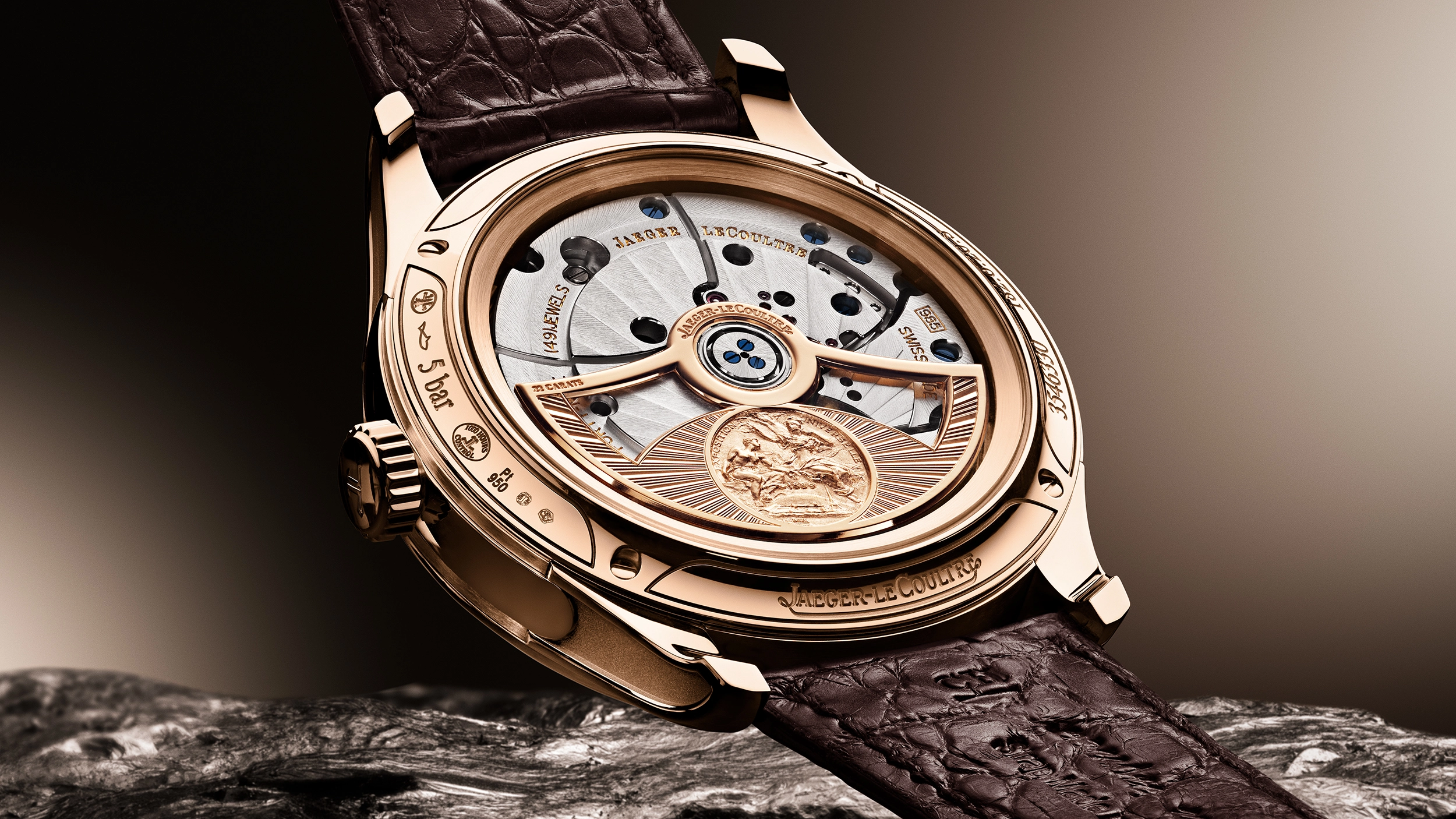 On the reverse side of the watch, the sapphire crystal case back reveals the exceptional precision of the Haute Horlogerie finishes on the movement, including blued screws, sunrayed Côtes de Genève, snailing and hand-bevelling. The winding rotor in 22k rose gold (916/1000) is decorated with sunray engraving and a reproduction of the gold medal awarded to Antoine LeCoultre at the 1851 Great Exhibition in London for his development of precisely calibrated stamping, cutting machines and mechanical lathes which allowed the components’ interchangeability.