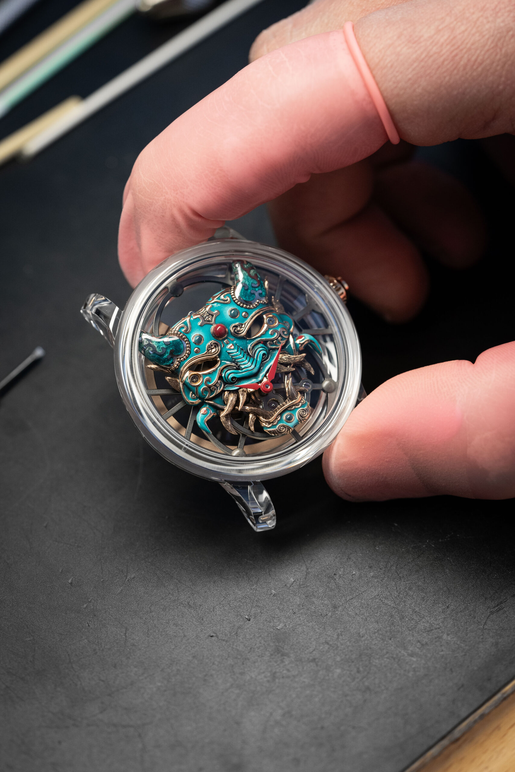 This unobstructed clarity reveals the mask’s exquisite details. While its primary surface is hand-painted, its horns are sculpted in translucent enamel. No part of the mask is flat—the red gold base is intaglio-engraved to accentuate the eyes, nose, and mouth, all outlined in gold. In a first for Jaquet Droz, Murano glass bead settings highlight the jade-green hues while fiery red accents echo in the two hand-painted hands.