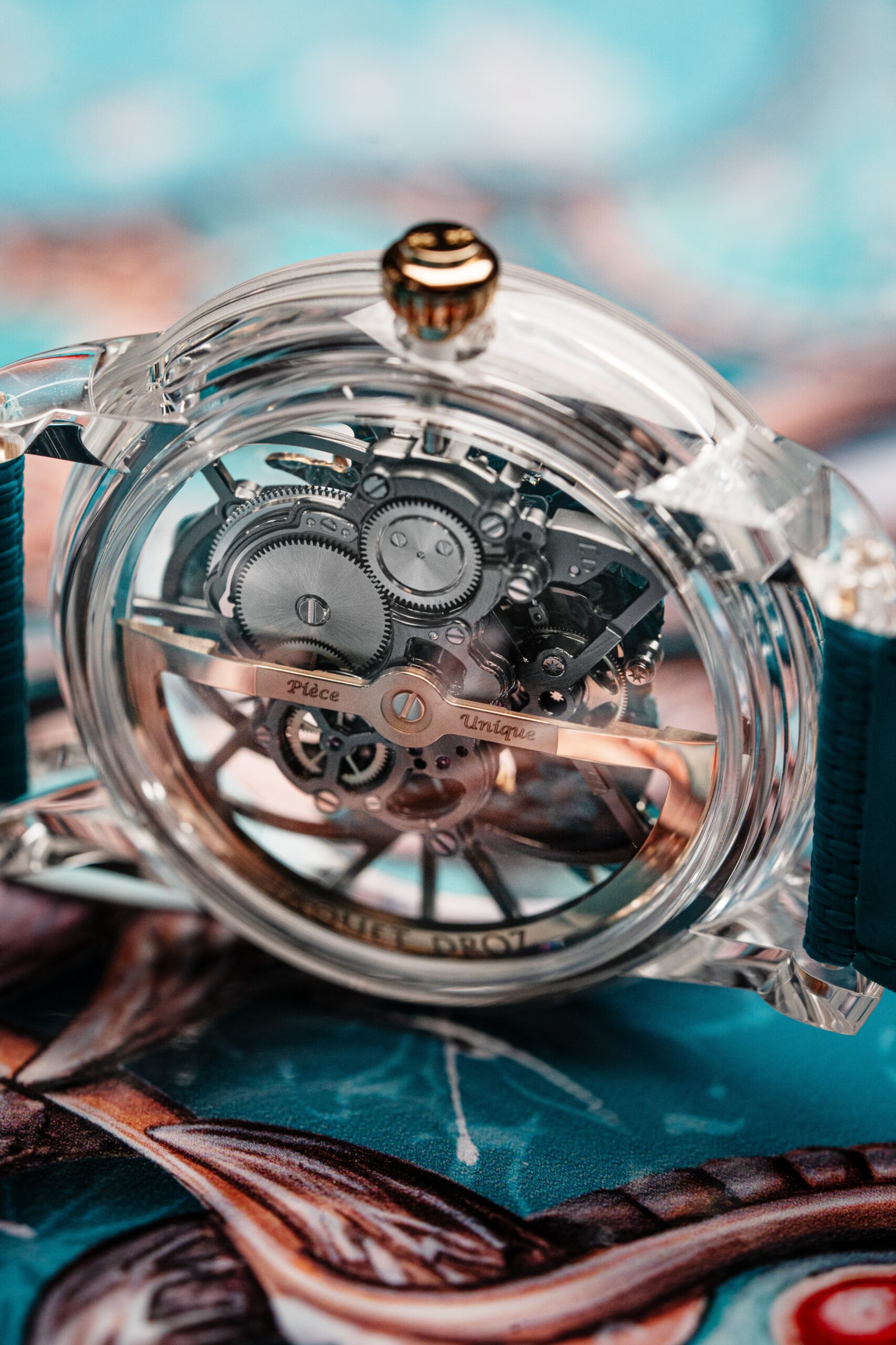 At the forefront of this masterpiece is micro-sculpture, bringing the Bushidô mask to life in striking three-dimensionality. Encased entirely in sapphire, the watch creates the illusion of the mask resting directly on the wrist. This sapphire case is a marvel in itself—unlike most counterparts on the market, it is 100% Swiss Made, produced in La Chaux-de-Fonds, with no screws or inserts to obstruct the view of the movement and dial.