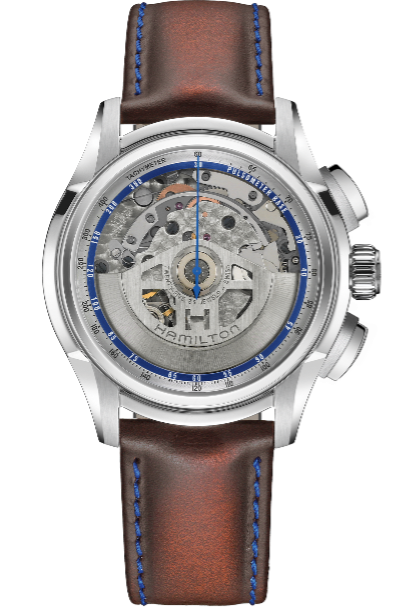 Hamilton’s watchmaking know-how comes into the spotlight thanks to the skeletonized dial design offering a glimpse of its H-41 automatic chronograph movement with 60 hours of power reserve.