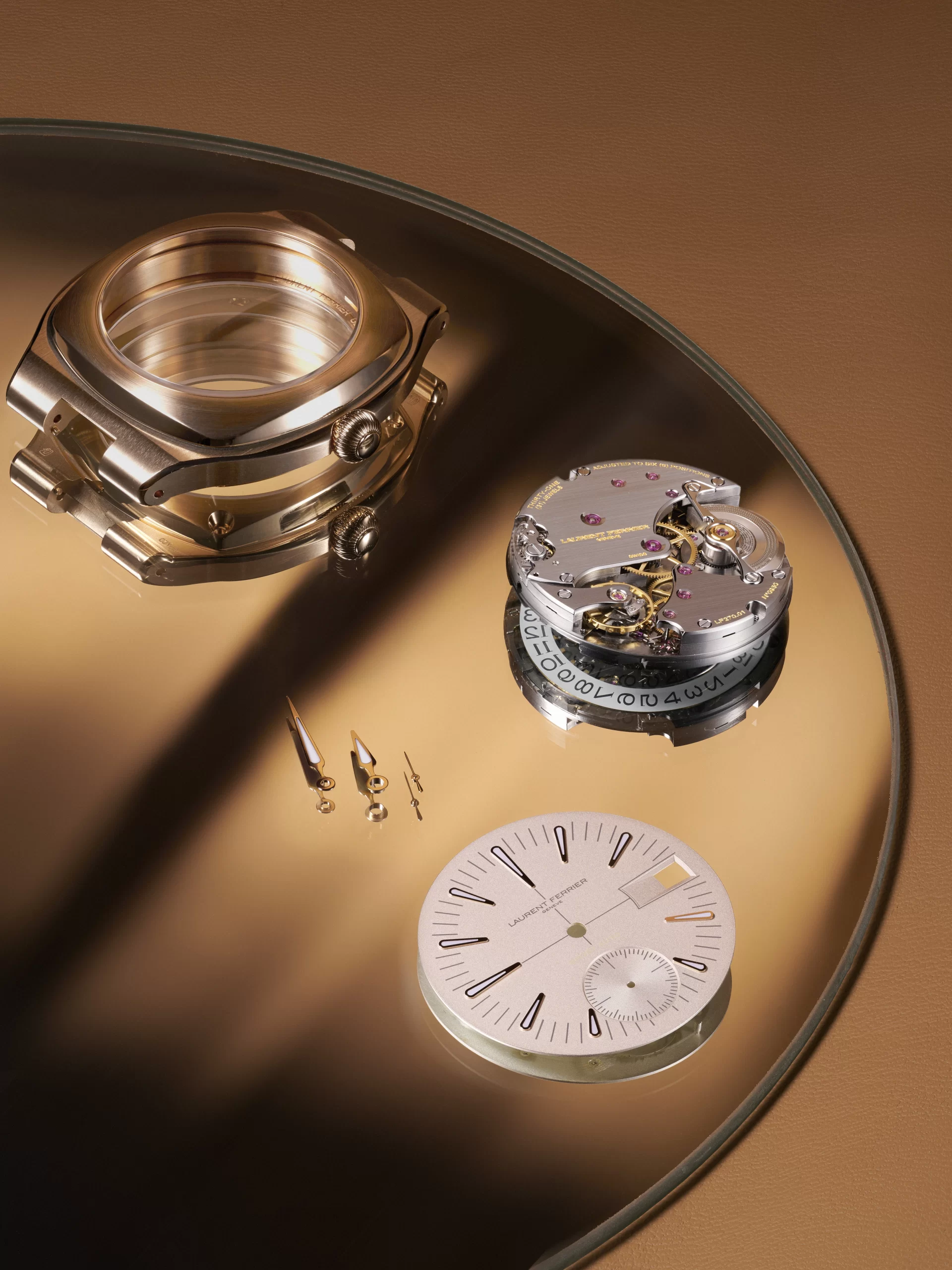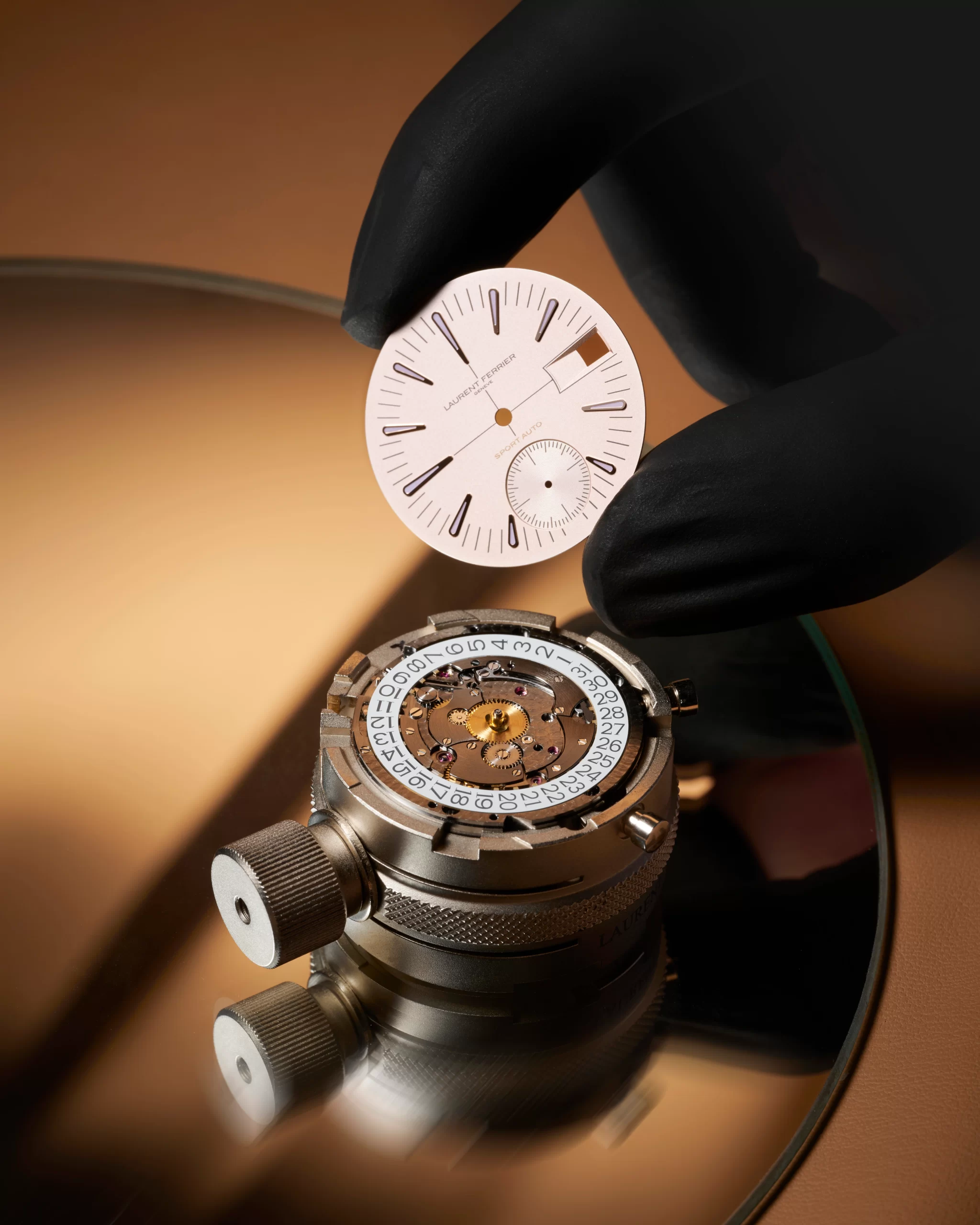 A great many finishing stages are carried out by hand in the heart of the LF finishing workshop. Among them, the decoration of the rotor bridge stands out for its remarkable precision: the bevelling of the corners, polishing with gentian wood and diamond paste, and the mirror-polished surface finish or “brouillage” (a scratch-brushing technique) on the main plate side. In all, it takes 2 to 3 hours to complete all the finishing stages on this component alone. This expertise is also showcased throughout the movement’s components, with their highly complex interior angles, black zinc-polished surfaces, and ruthenium satin-brushed or circular-grained finishes — all orchestrated in-house in the manufacture’s workshops.