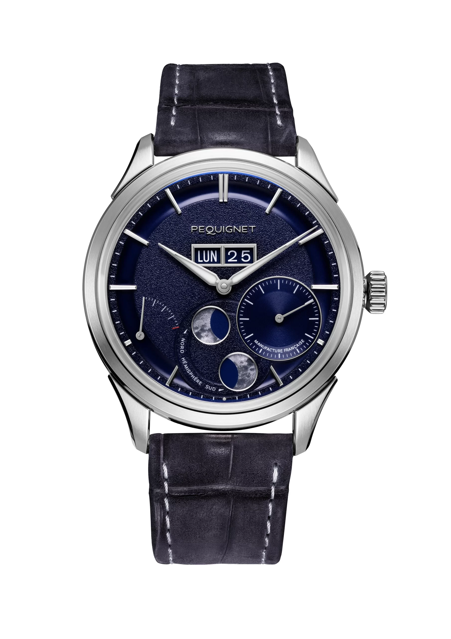 This Royale Paris features a unique representation of the moon phase complication from PEQUIGNET. For the first time, the moon is stylized in its two hemispheres: north and south. To achieve a more luminous effect, the moon windows have undergone diamond polishing.