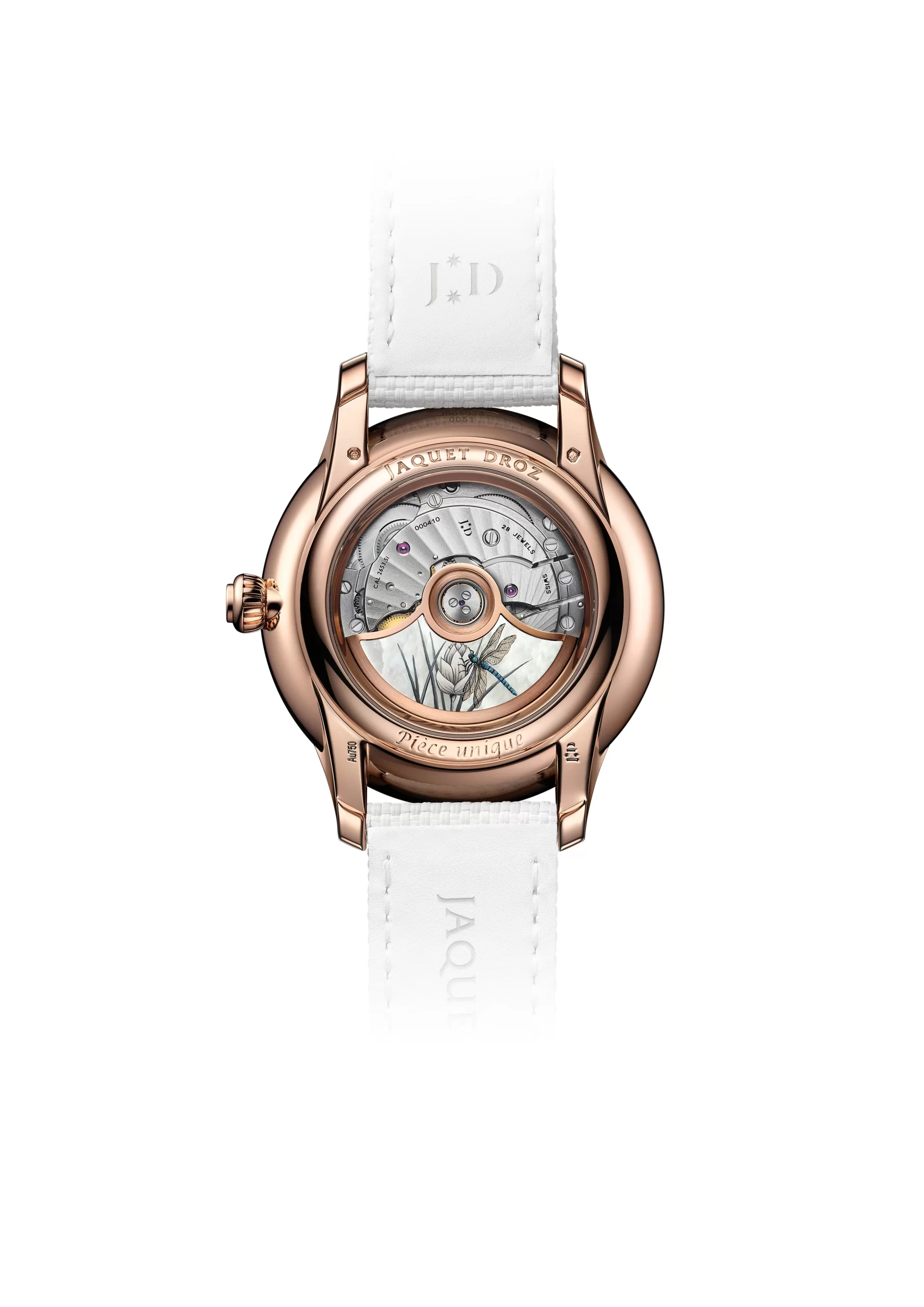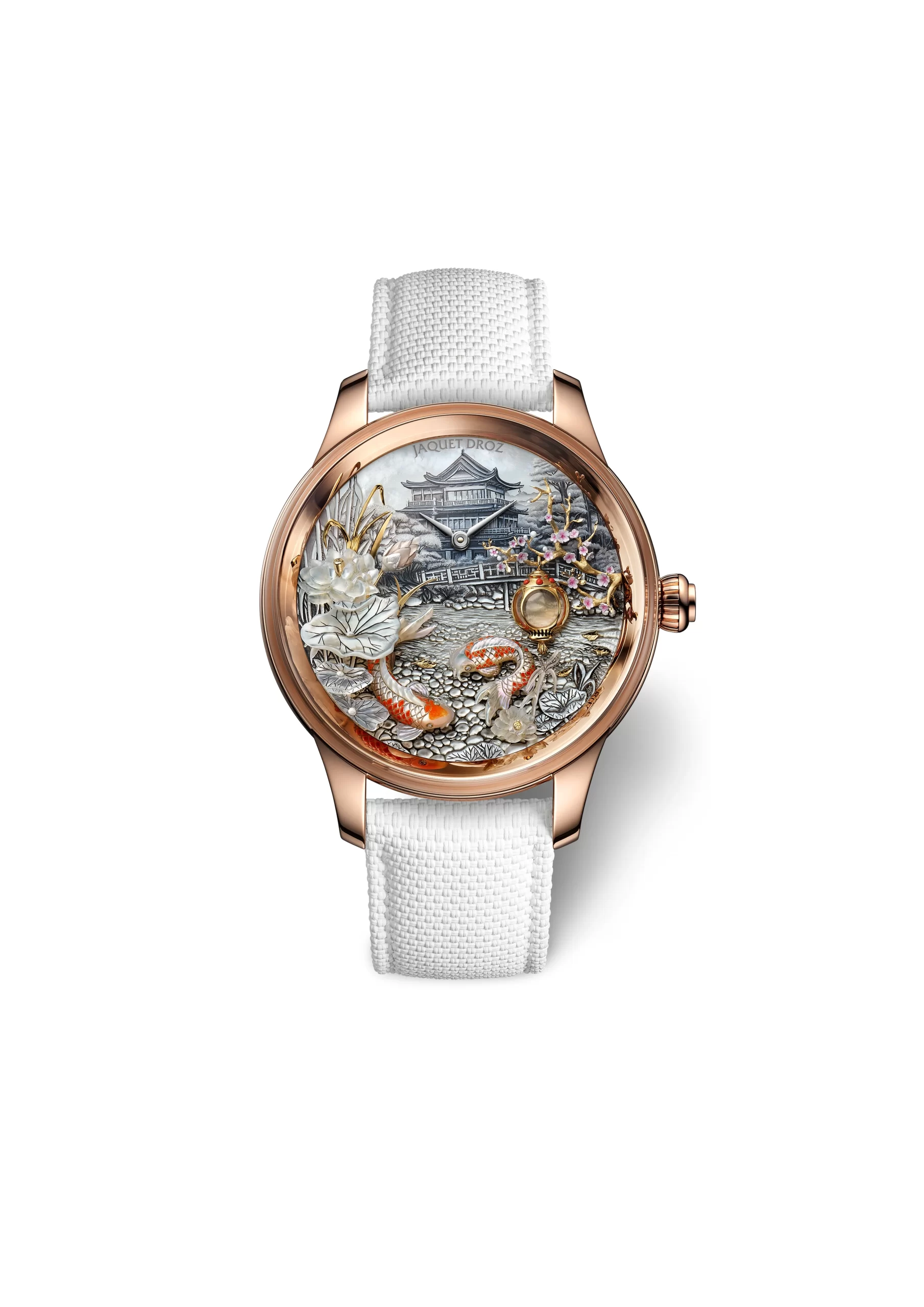 Jaquet Droz and a collector have joined forces to bring to life a creation that represents a landmark in the history of artistic craftsmanship: the Petite Heure Minute Red Gold – Japanese Garden. It consists of 25 appliques, most of which are made from carved and engraved mother-of-pearl. These are affixed to a dial which is itself made entirely from mother-of-pearl. The work of a precision goldsmith, executed by hand to within a tenth of a millimetre. A unique piece and a synthesis of excellence.