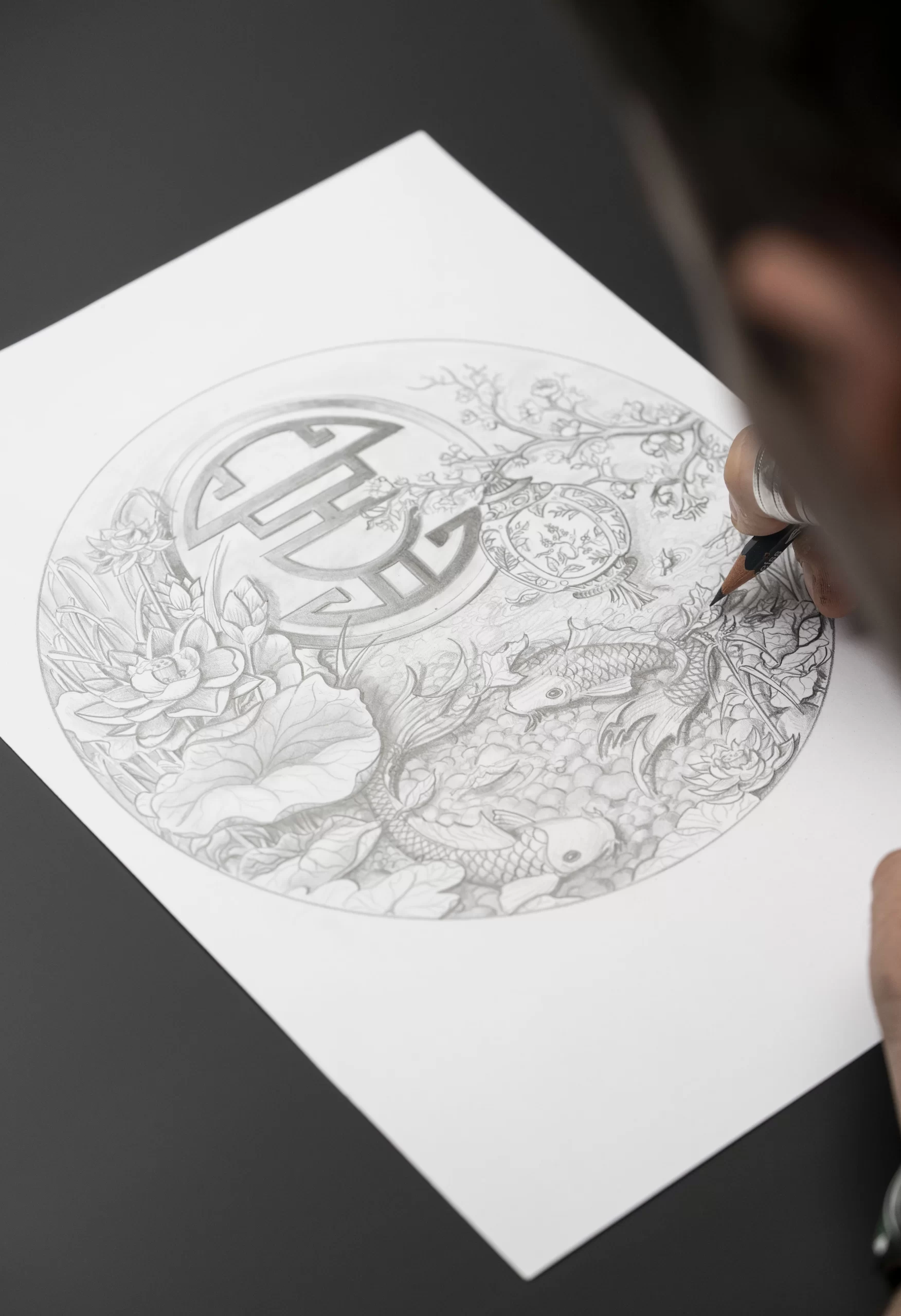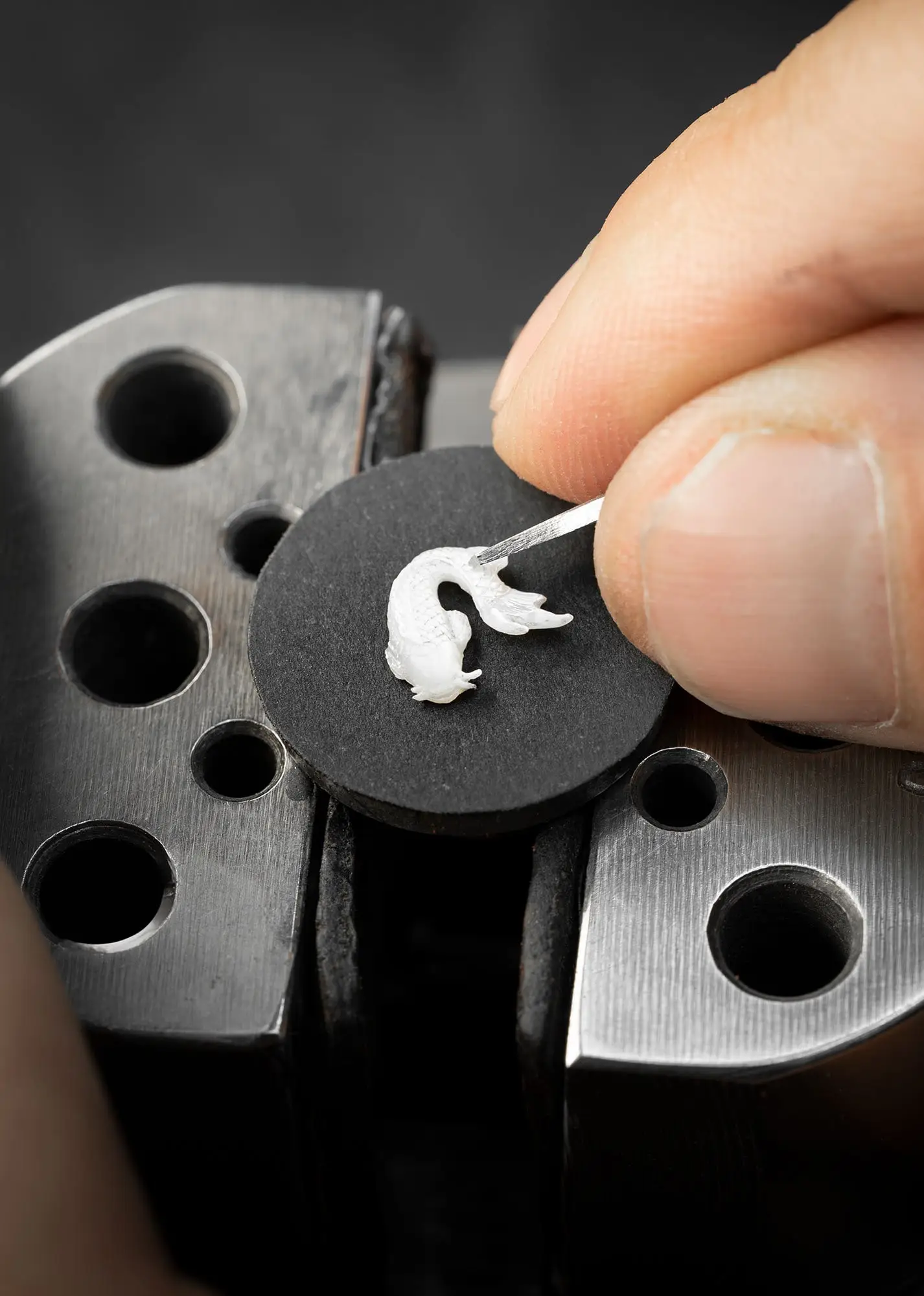 A host of other details help to create additional volume and perspective. The hour and minute hands glide beneath the decoration, positioned to within a tenth of a millimetre. The carp swim beneath the water lilies, but their eyes shine with the brilliance of 0.5 mm diamonds so that they sparkle on the surface. The leaves floating on the surface of the river are applied as gold paillons over the ripples and pebbles. The glass box crystal that tops the red gold case gives a glimpse of what lies beneath the appliques. Here, even in this location visible only to the collector, the decoration still reveals itself to be hand-engraved. A refined and singular secret – just like the piece itself.