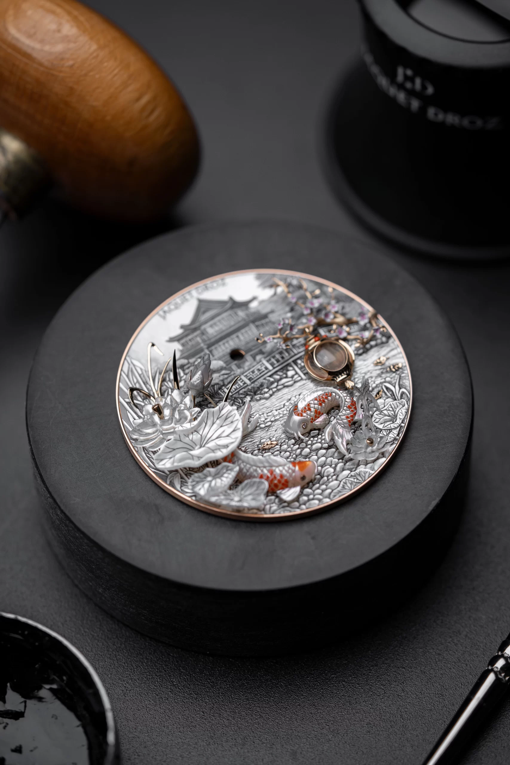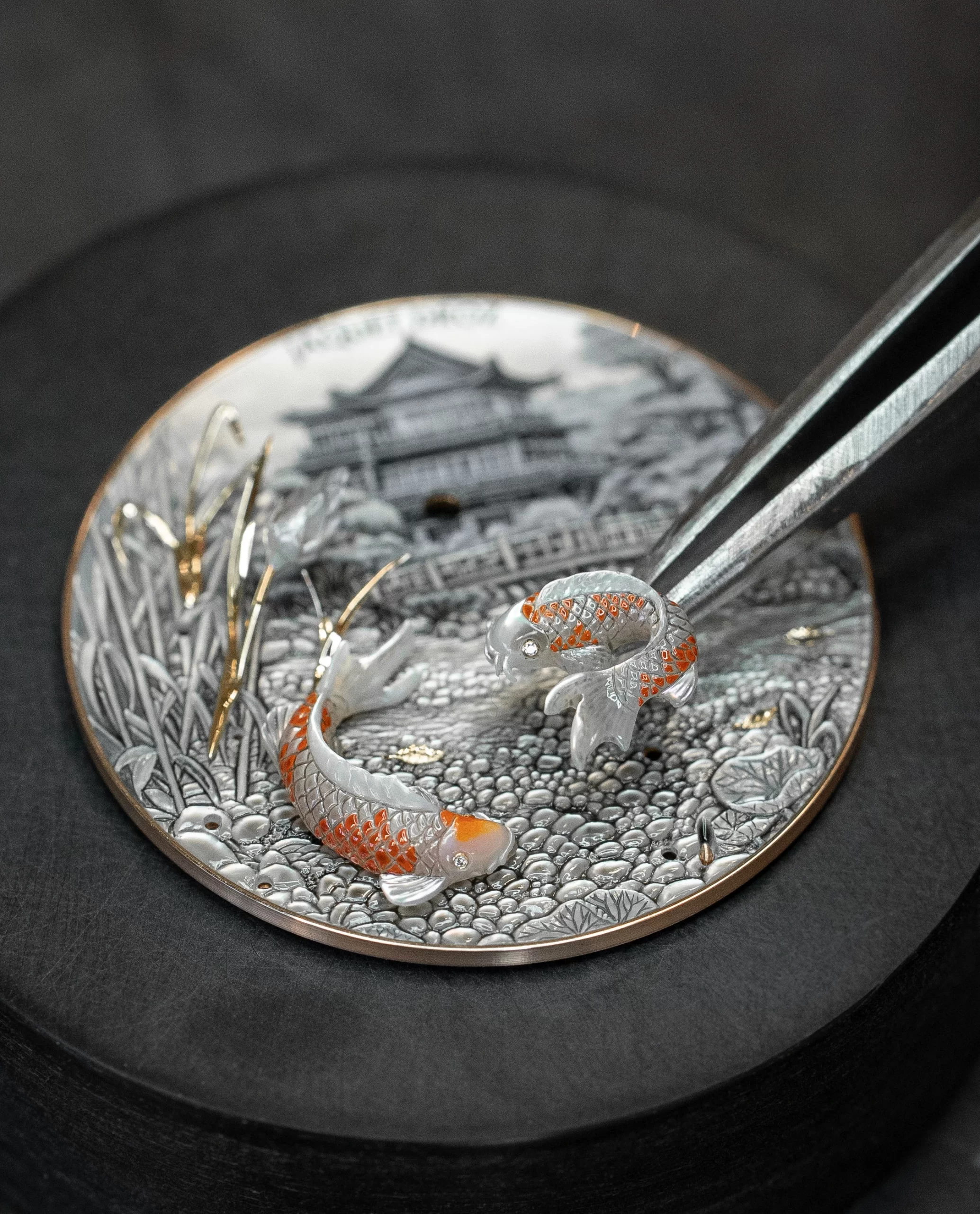 However, the temple does not merely appear in the background; it embodies it entirely, thanks to the 25 appliques positioned in front of it. On the left of the dial: reeds and water lilies. On the right: a cherry tree, a lantern. In the centre: a dance of koi carp. This is where we find the most exquisite applique of the entire scene: the reed stems emerging from the water are no more than 0.1 mm thick. Jaquet Droz had to devise an ingenious process to ensure that the stem at 5 o’clock could attach to the water lily petals on its left, all within a thickness of 0.1 mm.