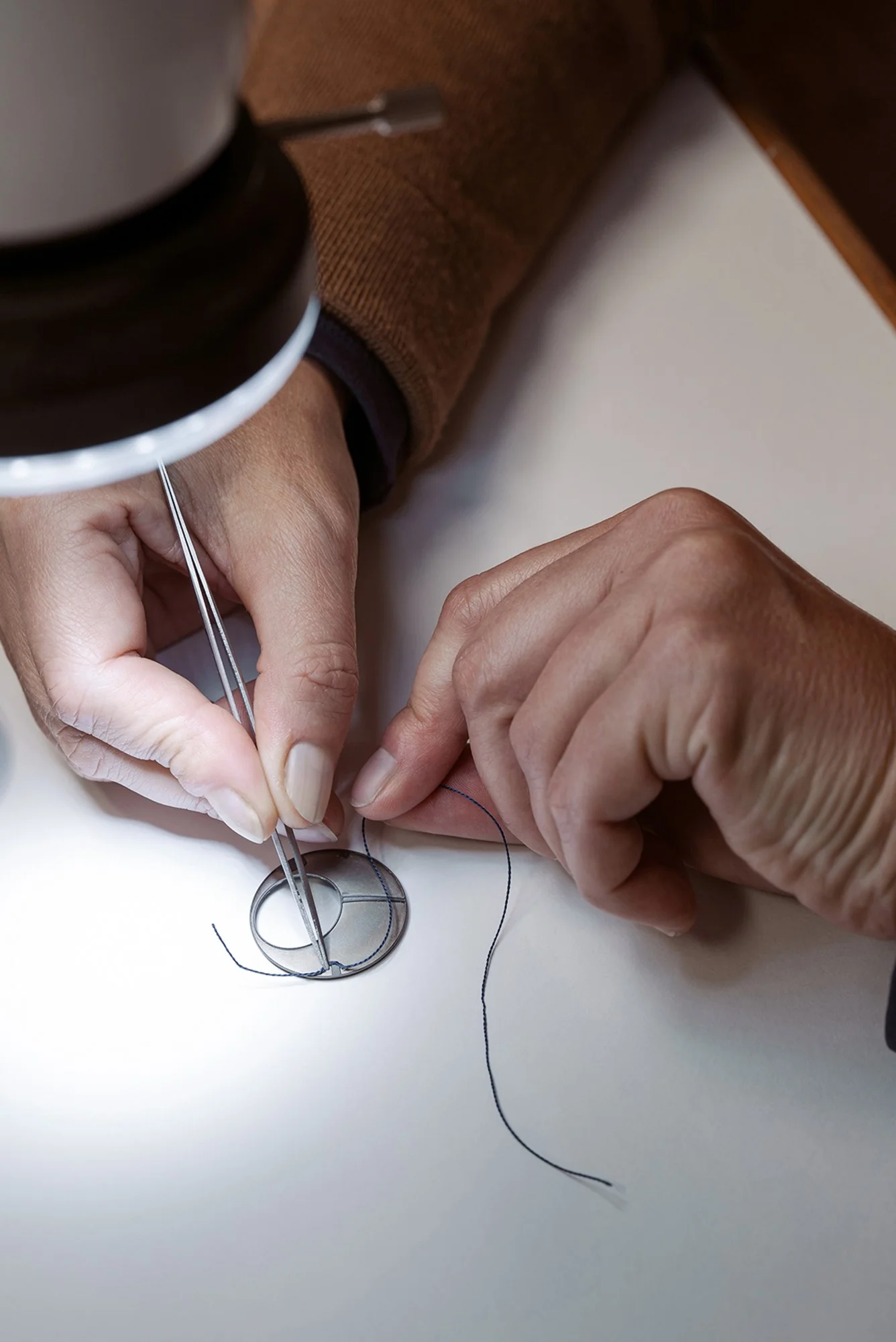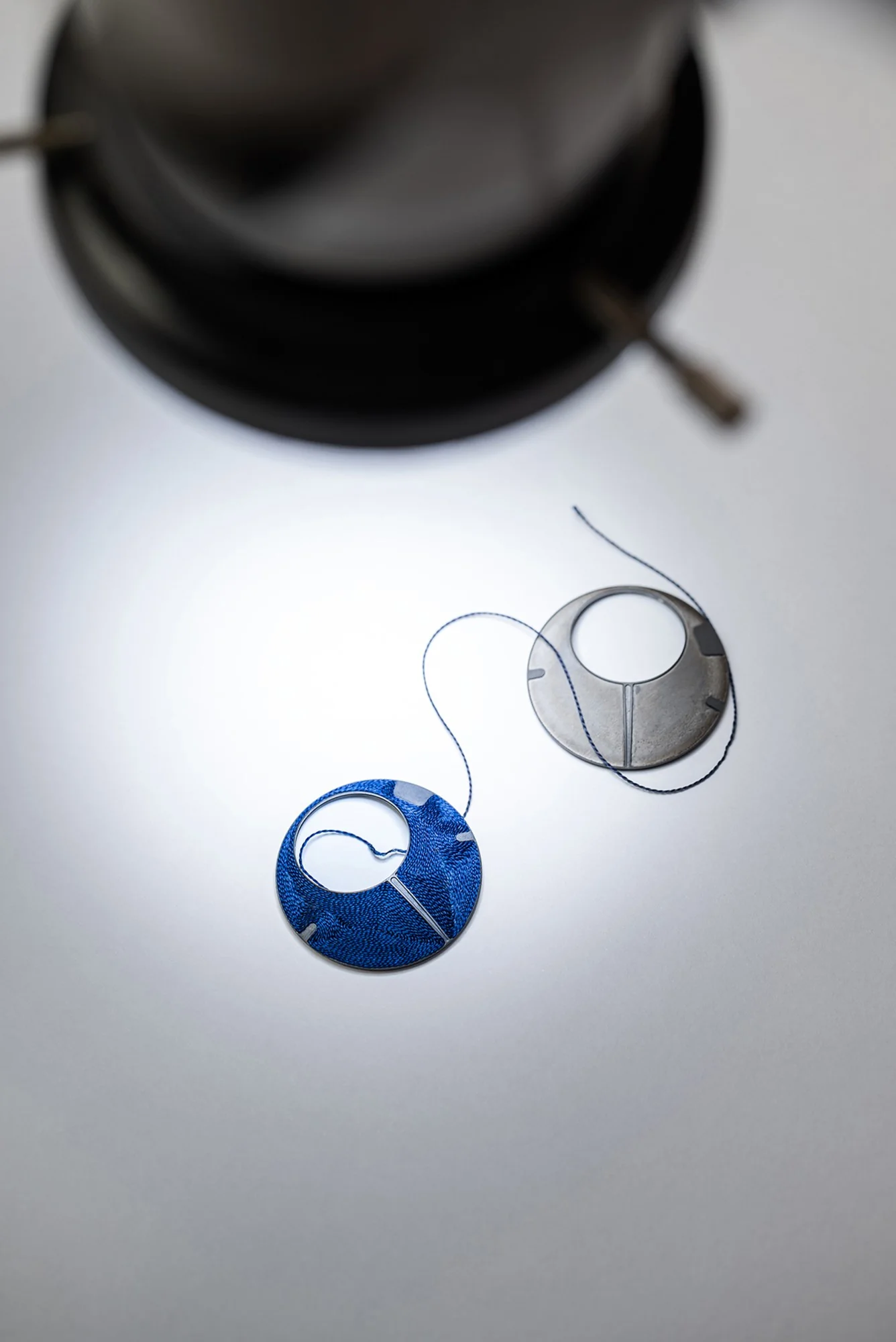 The delicate task of placing and bonding the silk thread to the titanium components was expertly carried out by a renowned Geneva-based atelier. Each dial requires two days of meticulous work by a skilled craftswoman. The thread is applied in a single piece, spiralling from the outer edge inward, following the contours of the cavity. To preserve the silk’s natural visual effect, special bonding materials are used to prevent glue from seeping into the fibres and altering the colour.