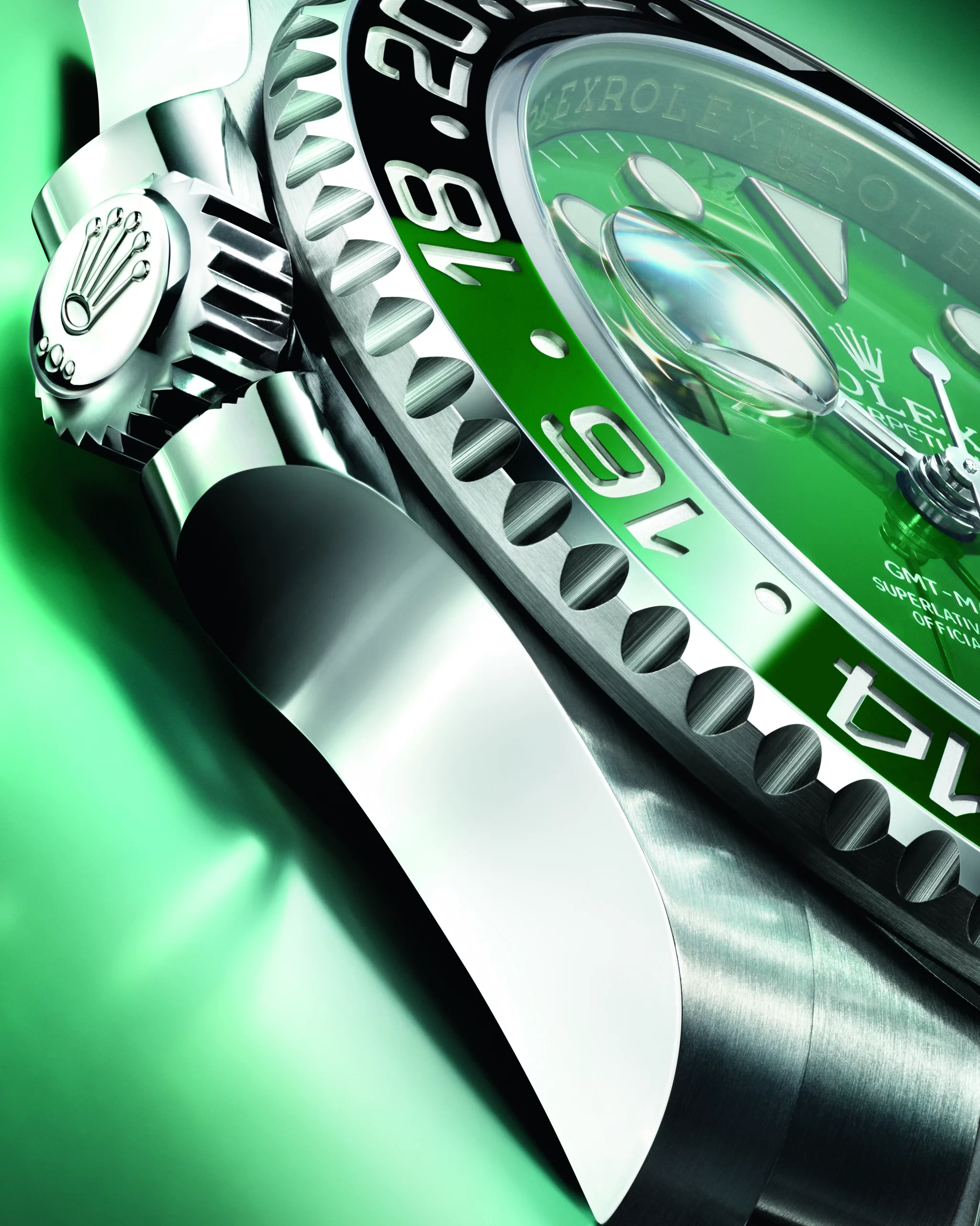 On the new version of the GMT-Master II, the bidirectional rotatable bezel is fitted with a two-colour, 24-hour graduated Cerachrom insert in green and black ceramic. The moulded, recessed graduations and numerals are coated with platinum via PVD (Physical Vapour Deposition). The bezel’s knurled edge offers excellent grip and can be manipulated with ease.