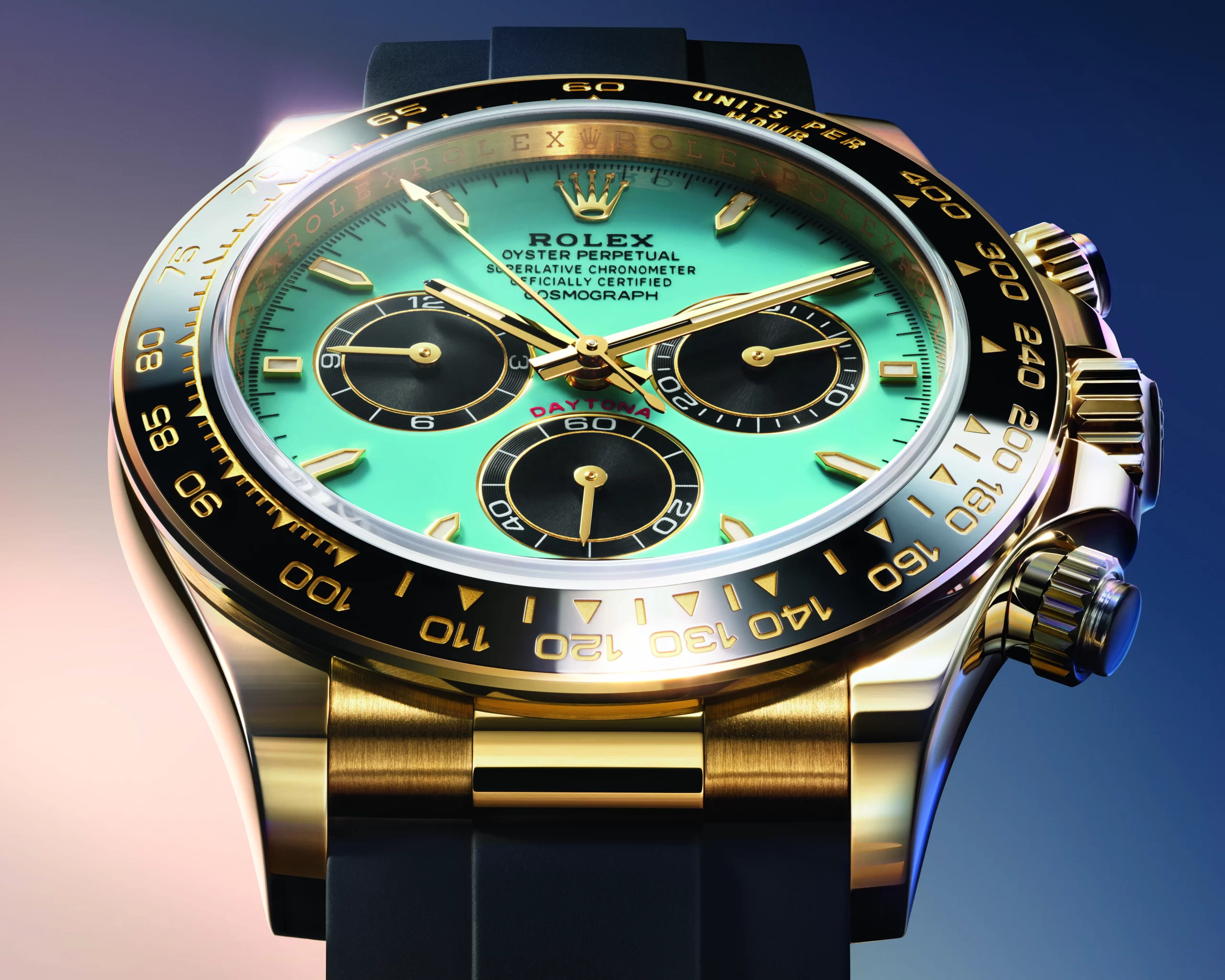 Thank you for reading this post, don't forget to subscribe!Indelibly linked to the world of motor sport and the measurement of elapsed time, the Oyster Perpetual Cosmograph Daytona is arrayed with a resplendent turquoise blue lacquer dial punctuated by bright black counters. Crafted in 18 ct yellow gold, this new watch is crowned with a black Cerachrom bezel showcasing the celebrated tachymetric scale that plays a key role in the model’s identity, and is complemented by an Oysterflex bracelet with Oysterlock safety clasp.