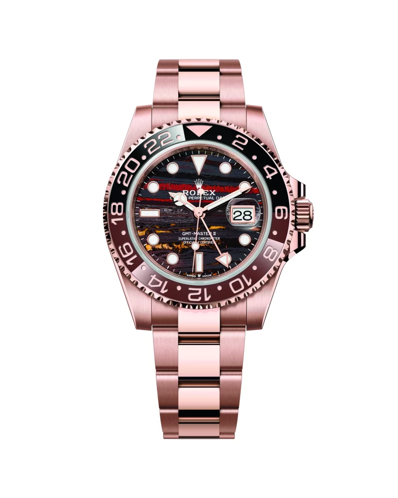 A cosmopolitan watch designed for all those who criss-cross the globe, the Oyster Perpetual GMT-Master II is offered with a new dial, made from tiger iron. This natural stone, containing a combination of tiger’s eye, red jasper and hematite, has a fascinating hybrid appearance. The watch presented is in 18 ct Everose gold with a brown and black Cerachrom bezel insert. It is fitted on an Oyster bracelet, itself equipped with an Oysterlock safety clasp.