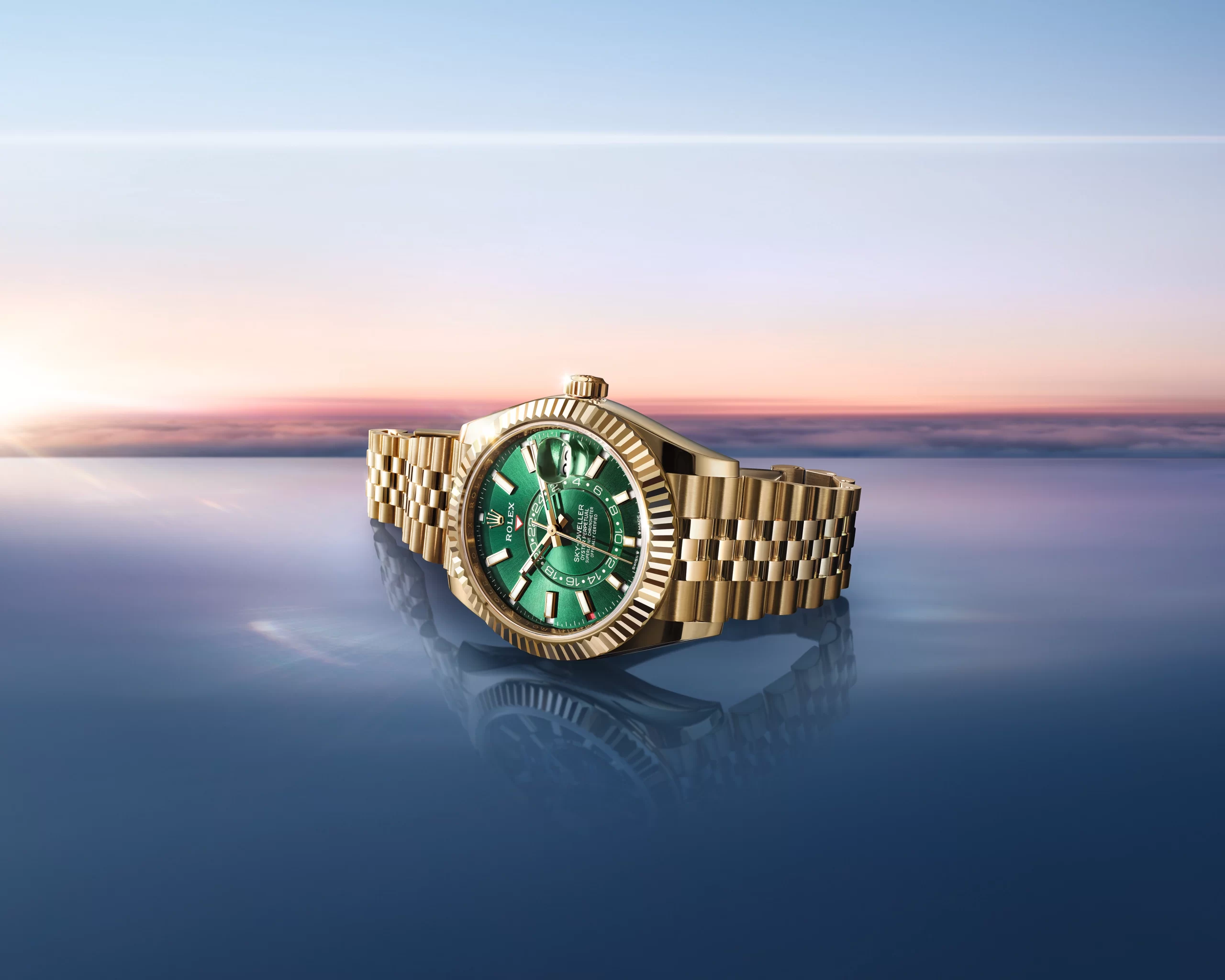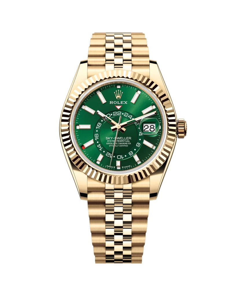 The fluted bezel of the Sky-Dweller with bright green dial is fashioned from 18 ct yellow gold – the same material as its Oyster case and Jubilee bracelet.