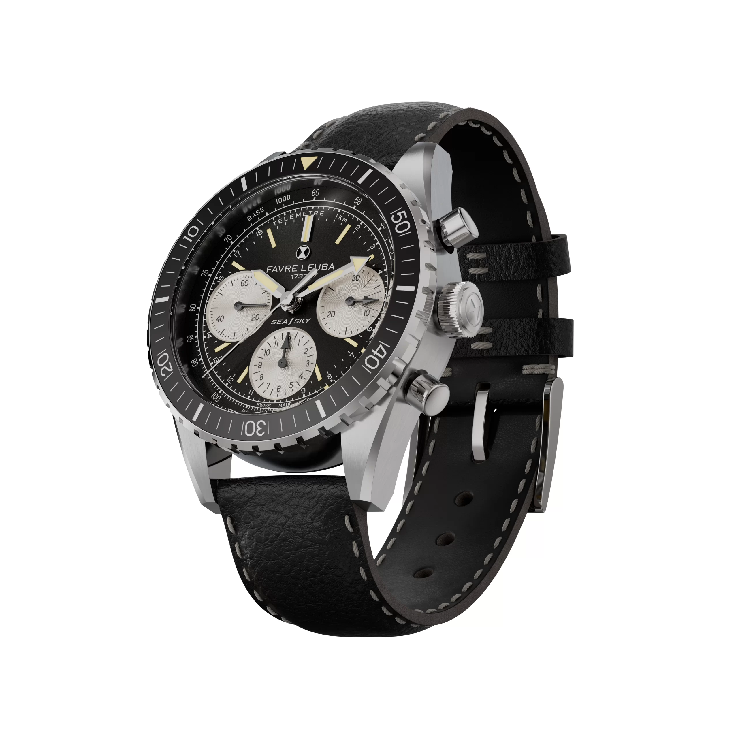 Favre Leuba’s Sea Sky Chronograph epitomizes Swiss watchmaking at its best, with peerless precision and exceptional quality. This piece features a 40mm case in 316L stainless steel, finished with a juxtaposition of polished and brushed surfaces for that dashing elegance of rugged refinement.