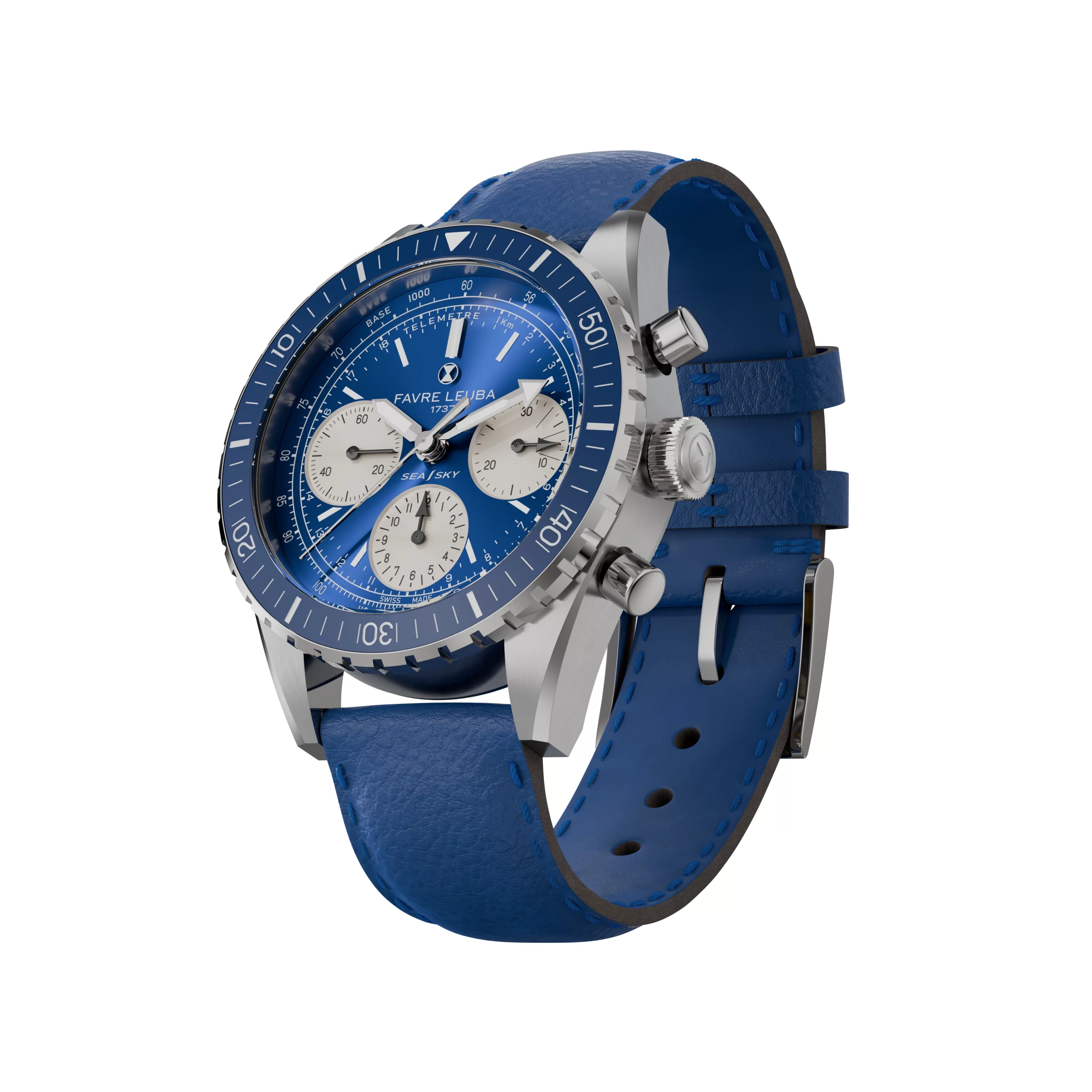 The Sea Sky Chronograph’s proportions and design blend sportiness with casual chic, evoking the timeless elegance of 70s watches. Water-resistant to a depth of 100 meters, it comes with a leather pin buckle strap featuring a quick and convenient interchangeability system.