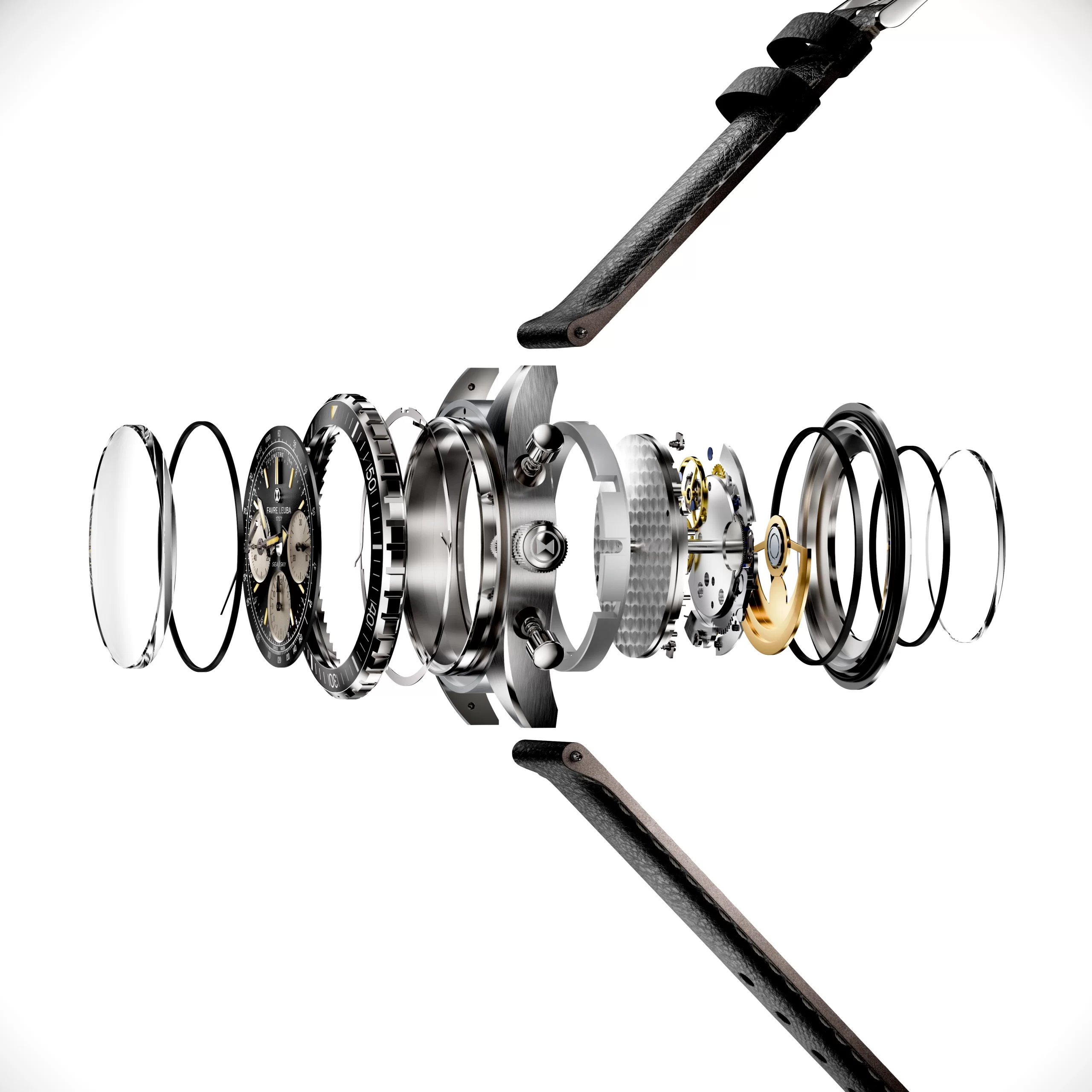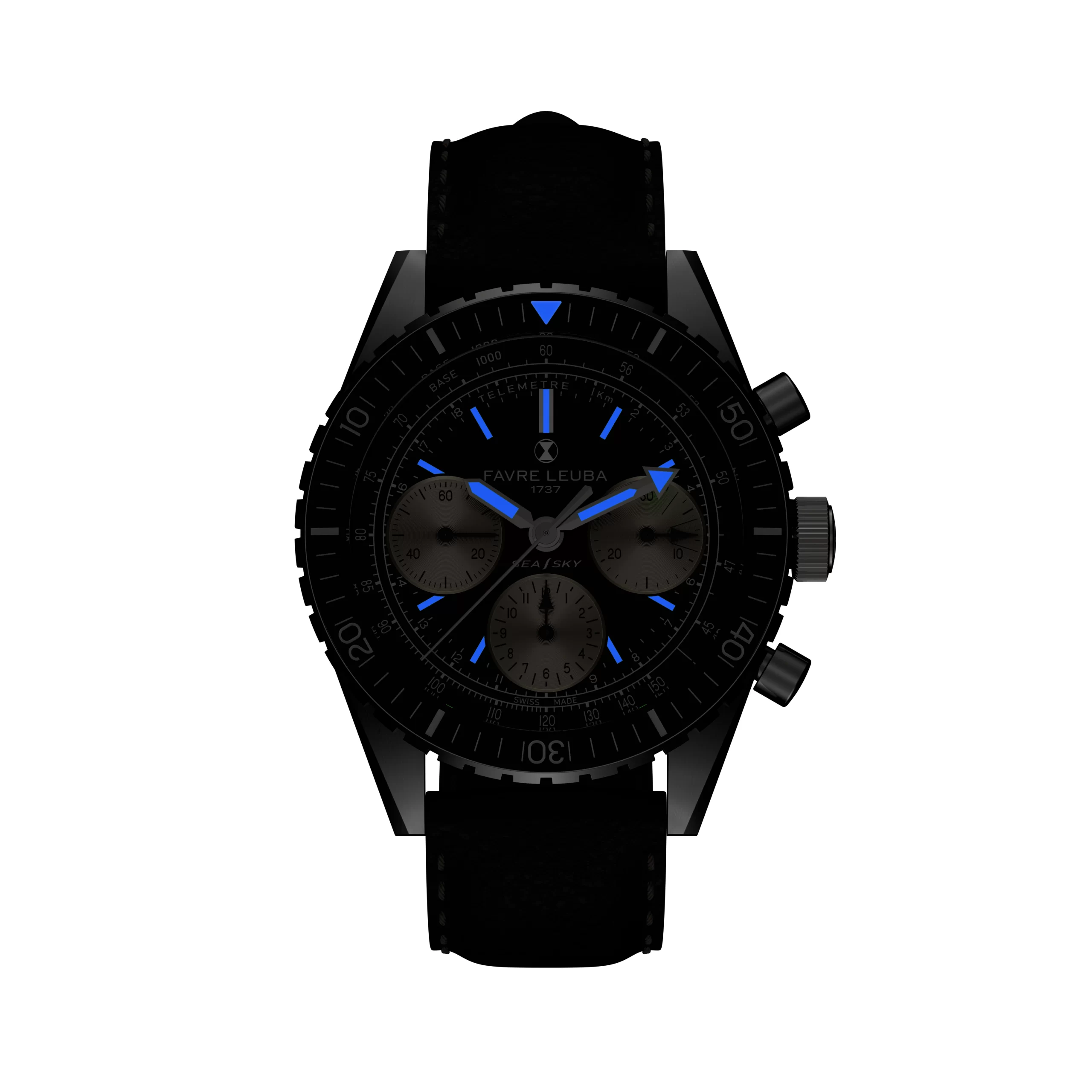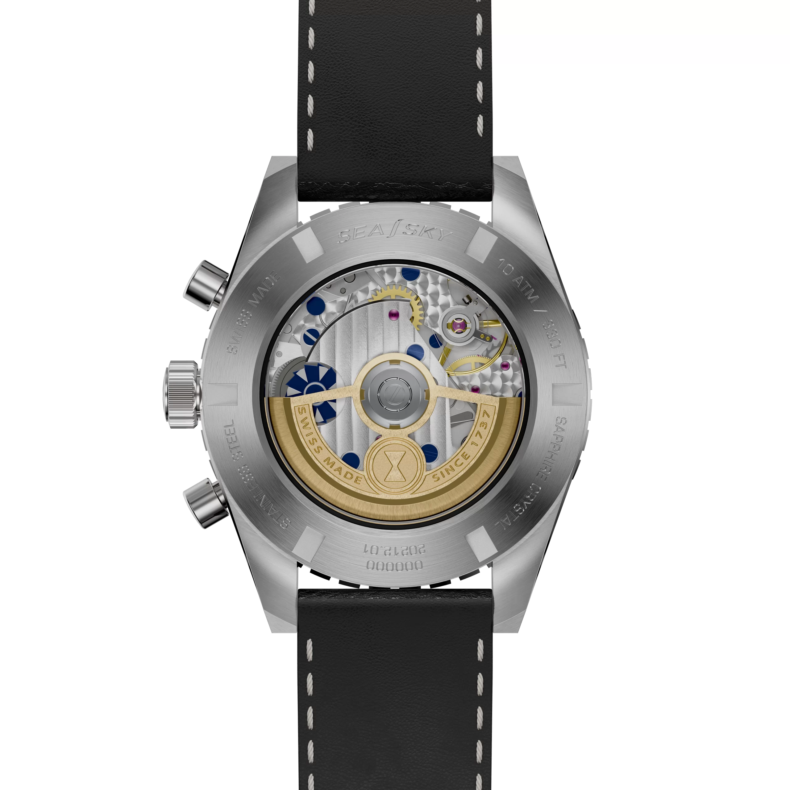 The dial on the Sea Sky Chronograph includes a tachymeter scale for measuring velocity over a known distance (ideal for pilots, race car drivers, or those who need a quick fix on the average speed over a fixed distance) and a telemeter scale for calculating the distance to an event based on sound wave propagation (useful for military personnel, meteorologists, or anyone having to measure the progress of an approaching thunderstorm, for instance). Besides practical functionality, the scales add an aesthetic and technical dimension that appeals to discerning watch enthusiasts.