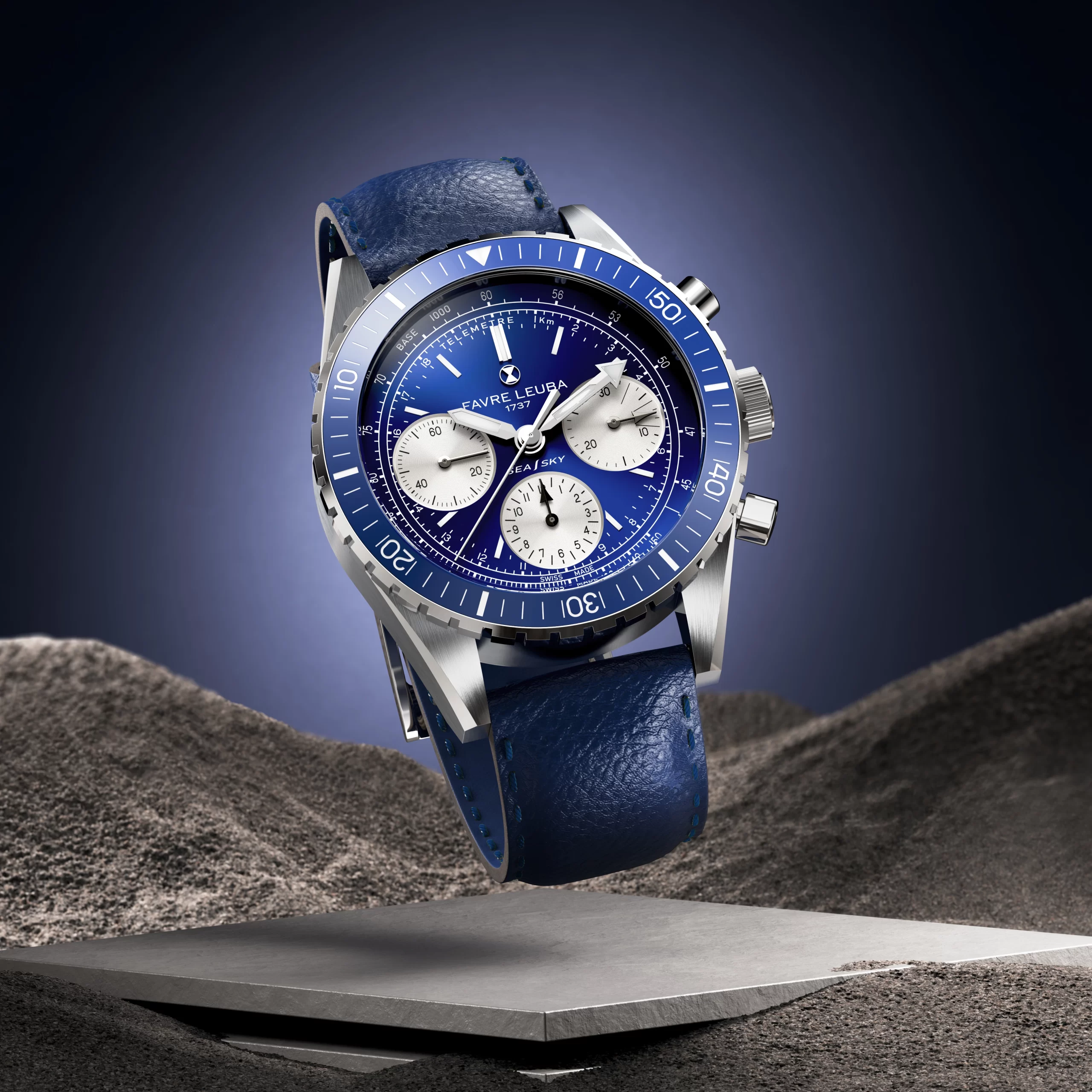 The Sea Sky Chronograph is topped with a double-domed sapphire crystal with an anti-reflective coating that makes the dial pop and ensures optimal readability in all conditions. The unidirectional rotating bezel, in black ceramic and engraved with countdown markers, provides practical functionality for precision enthusiasts.