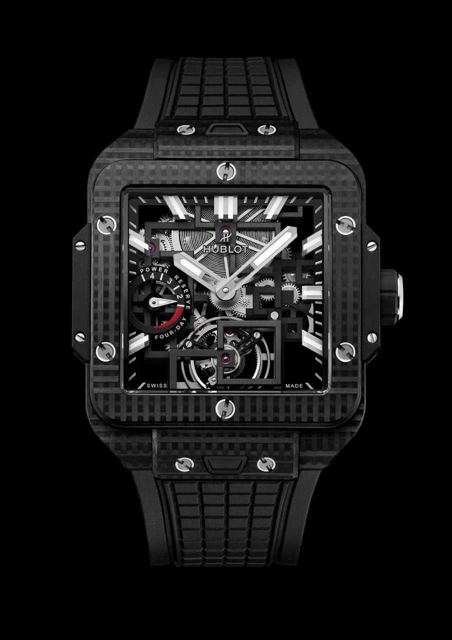 The Square Bang Tourbillon 4-Day Power Reserve is the first Square Bang with two central hands. It also features many other firsts. The first to offer a 3D carbon case. The first to be regulated by a Tourbillon.