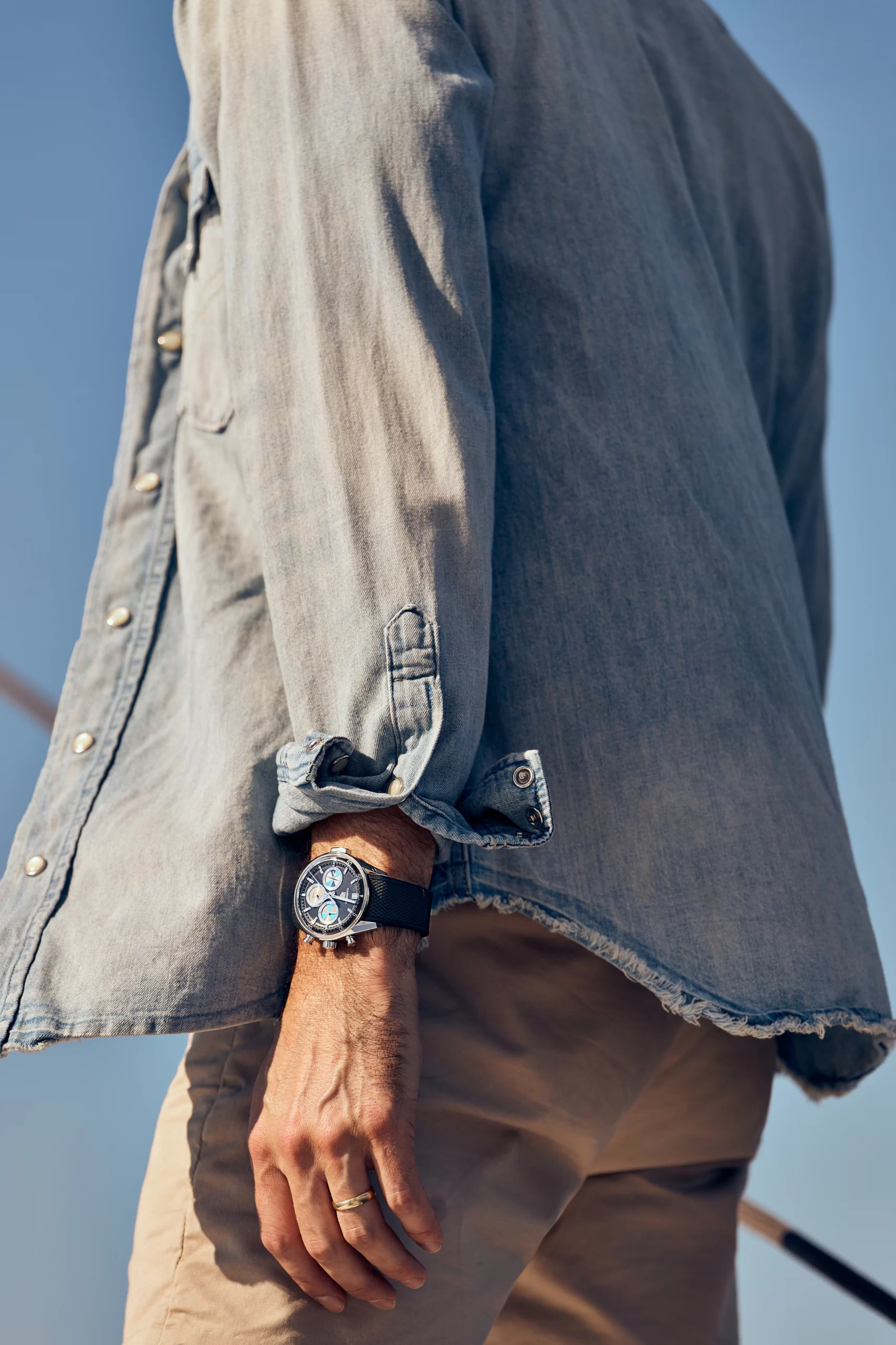 Looking a bit closer, the Seafarer logo was relocated to the sub-register at 6, leveraging a Carrera font inspired by the late reference’s characterful blocky type. The brands kept the feeling of the late Reference 2446C Seafarer but made a conscious decision to look to the future of TAG Heuer with the present-day TAG Heuer and Carrera logos at 12 o’clock. Consistent with all models of the heritage Seafarer, the usual date window from the Carreras you see today was also removed, and the watch is fitted to a black textured rubber strap, making it fit for life at sea.