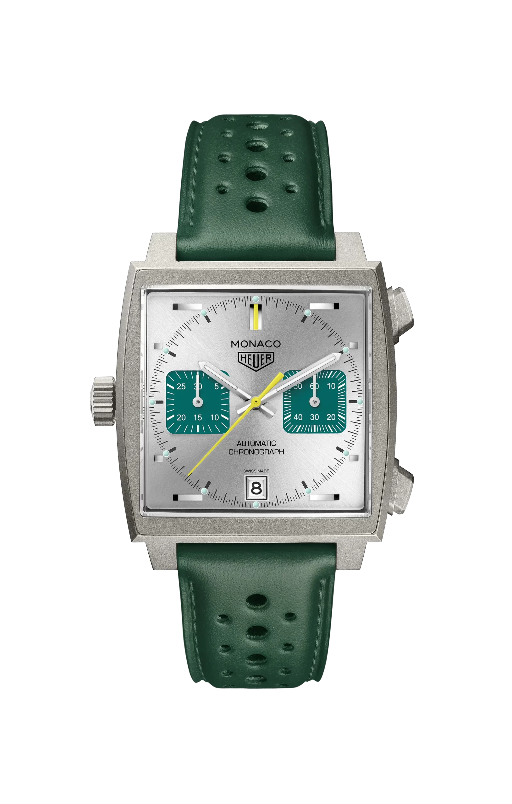 Every element of the TAG Heuer Monaco Chronograph Racing Green is inspired by historical British racing cars and their white and yellow touches. To echo this theme, the watch boasts a silver sunray-brushed dial for a timeless and elegant look, a subtle reminder of the engine-turned dashboards seen in sports cars of the 1920’s and 1930’s.