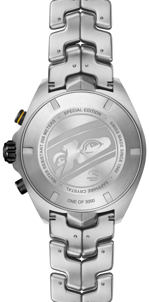 The black tachymeter bezel with aluminum insert is engraved with “SENNA” and the yellow “S” logo at 12 o’clock, while the DLC-coated crown at 3 o’clock and DLC-coated push-buttons at 2 and 4 o’clock enhance both durability and style. The special engraved steel caseback with an illustration of Senna reinforces the watch’s authenticity. The TAG Heuer Formula 1 Chronograph x Senna 43mm comes with a folding steel clasp with double safety push- buttons and is presented in a distinctive blue box with a yellow cushion and interior accents, including the yellow ‘S’ logo. Limited to 3,000 pieces, this model is both a radiant celebration of Senna’s life and a timeless collector’s item, offering enthusiasts a complete set of functions – hours, minutes, seconds, chronograph, date, and a secure entry point to the Senna line.