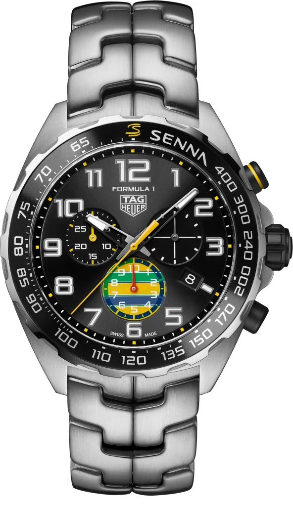 Guided by Senna’s fearless spirit and relentless pursuit of excellence, the TAG Heuer Formula 1 Chronograph x Senna 44mm pushes the partnership further with a dynamic new high-end expression powered by an automatic movement. Its design draws inspiration from Senna’s helmet and his Brazilian identity: a sunray-brushed black dial energized with vivid accents, a 6 o’clock subdial in the colors of the national flag, a 12 o’clock 30-minute chronograph counter with yellow lacquered hand, and a 9 o’clock running seconds counter with yellow “S” logo, while a yellow lacquered central seconds hand sweeps across the dial with powerful precision. New indexes inspired by Formula 1® livery geometry, along with skeletonized black lacquered hour and minute hands, enhance readability and style.