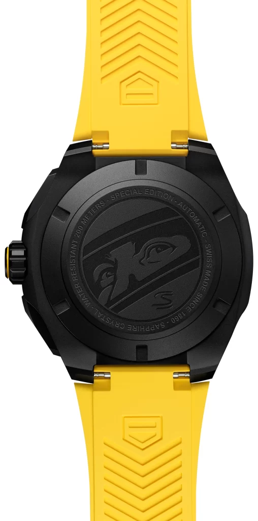 The 44mm case is crafted in lightweight titanium with black DLC coating, a nod to Senna’s fearless approach on the track. The forged carbon bezel, engraved with his recognizable “S” logo at 12 o’clock, highlights cutting- edge materials and engineering. Additional details include a yellow lacquered crown, a yellow ring between the case and bezel, and new shaped pushers at 2 and 4 o’clock, reflecting the watch’s bold technical design. The caseback displays an engraving of Senna’s piercing eyes behind the helmet, a poignant reminder of the man whose gaze captivated the world.